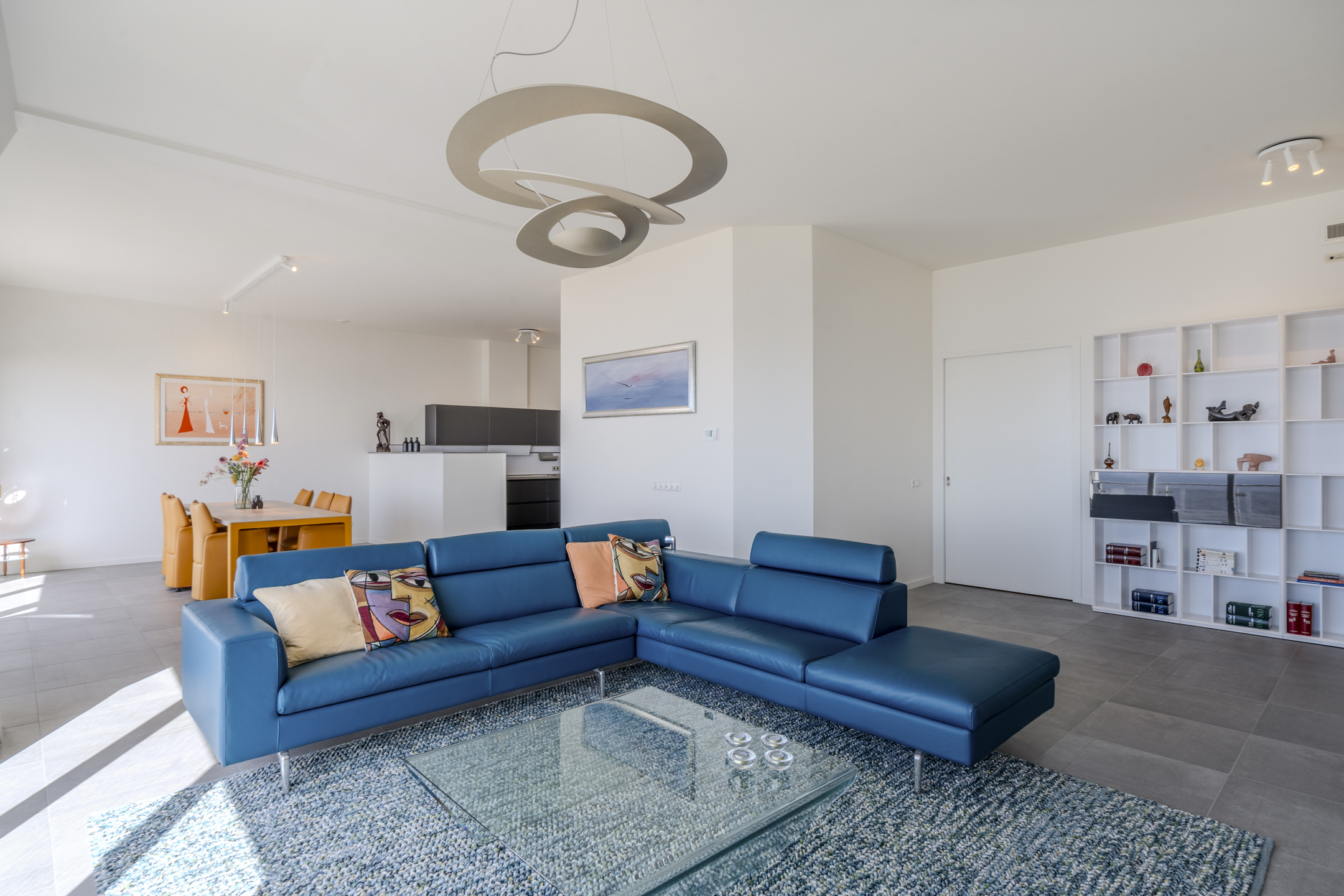 De royale living vormt het hart van de woning, met directe toegang tot een dubbel balkon waar binnen en buiten naadloos in elkaar overlopen. De grote raampartijen zorgen voor een zee aan licht en een ongeëvenaard panoramische uitzicht.