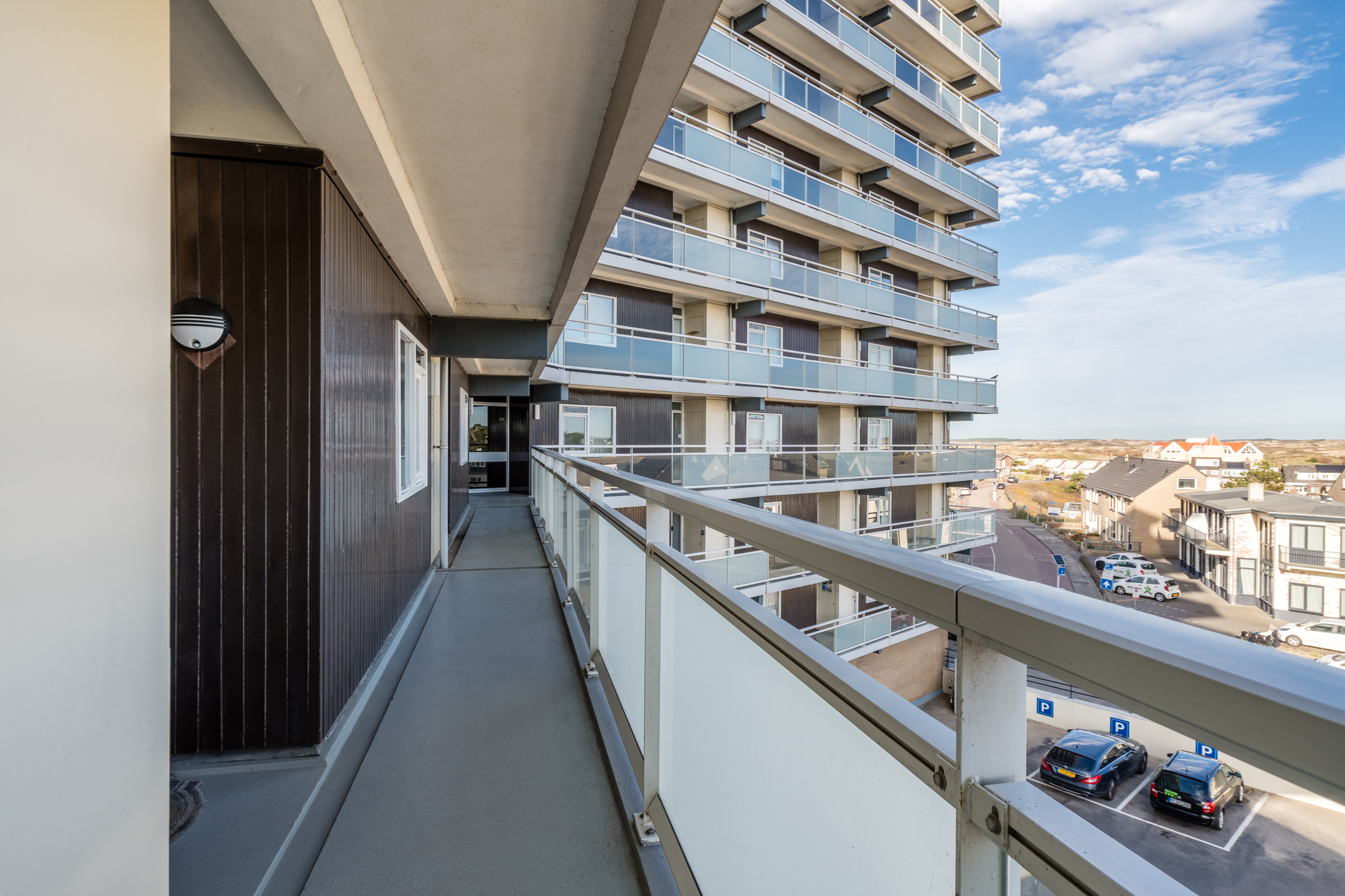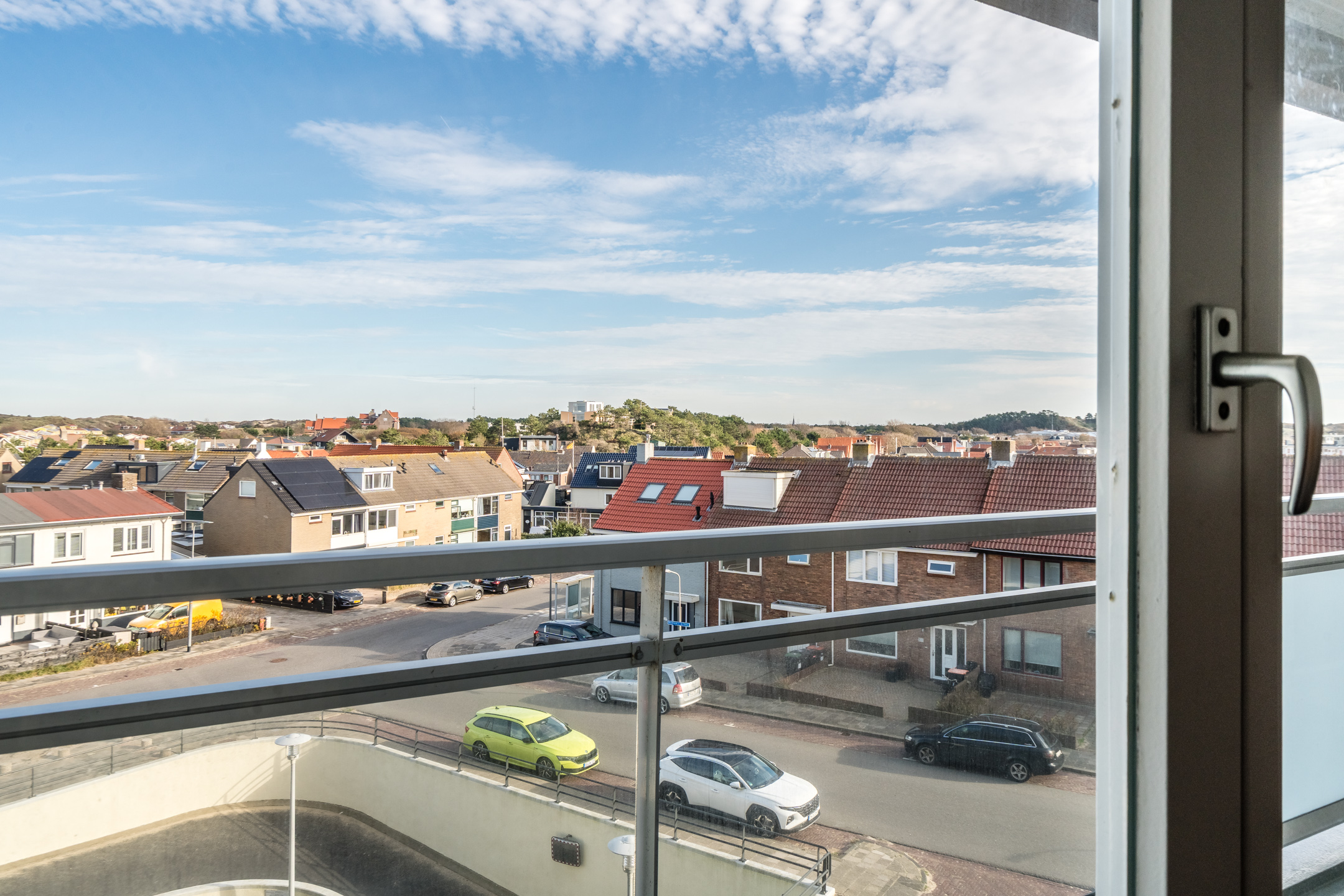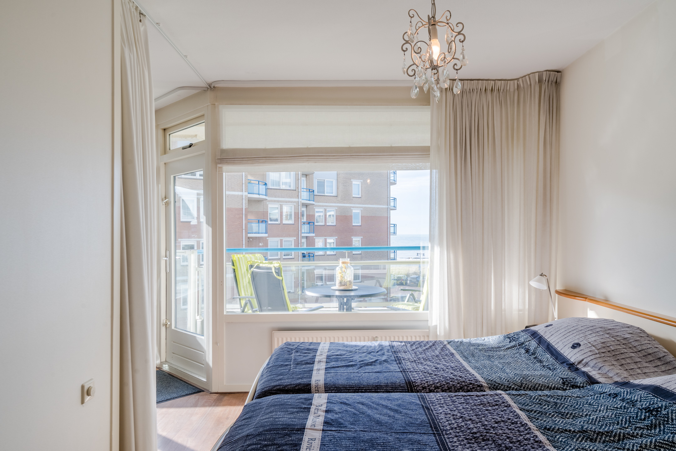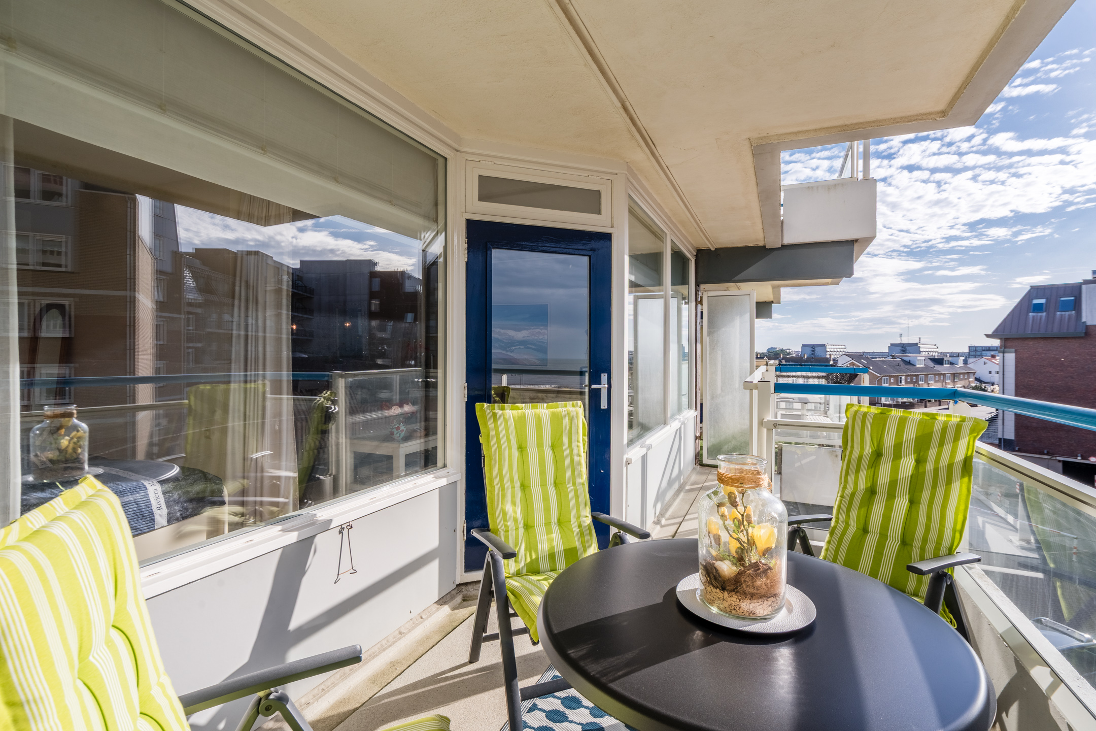 Via de woonkamer stap je het ruime balkon op, gelegen op het zuidwesten. Een heerlijke plek om te ontbijten in de zon of te ontspannen met een goed glas wijn terwijl de avond valt.