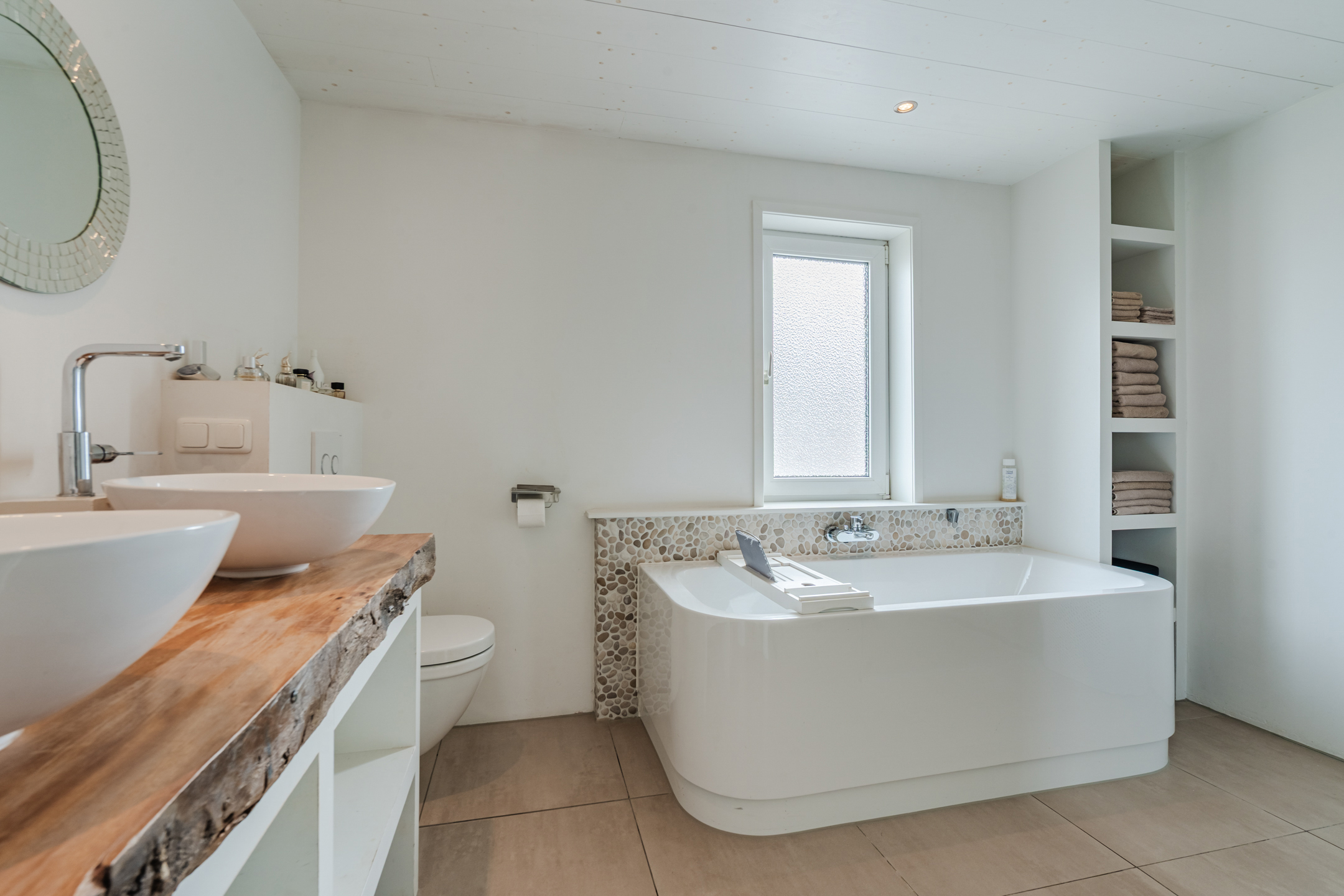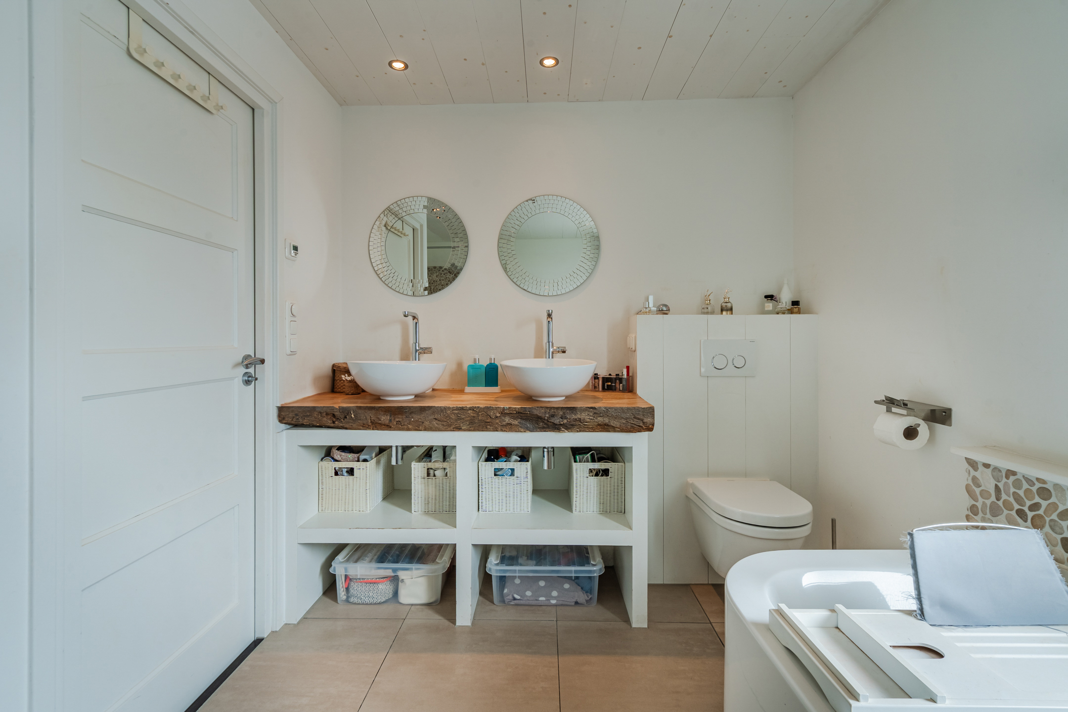 - Badkamervoorzieningen Ligbad, toilet, dubbele wastafel, inloopdouche
