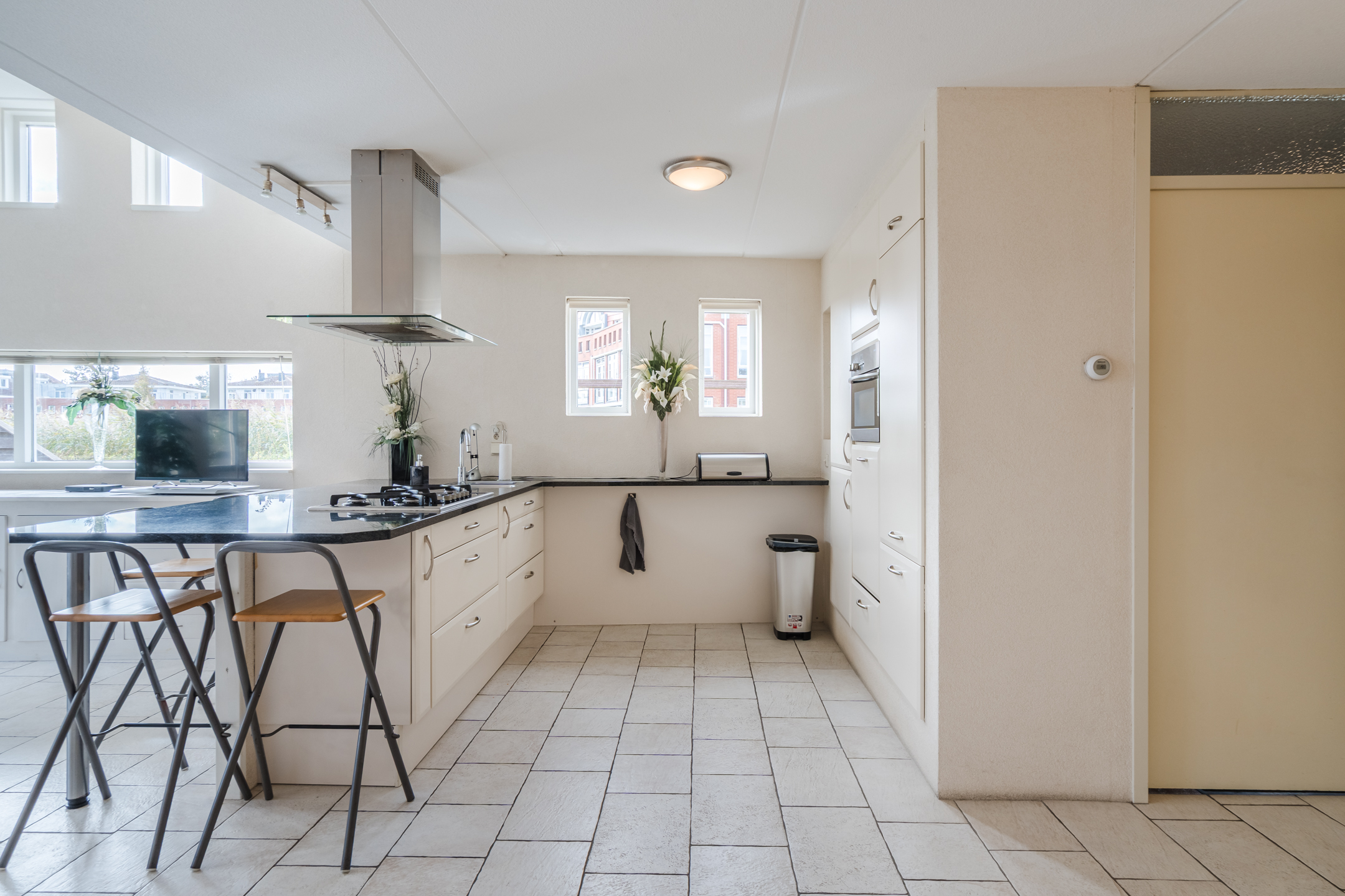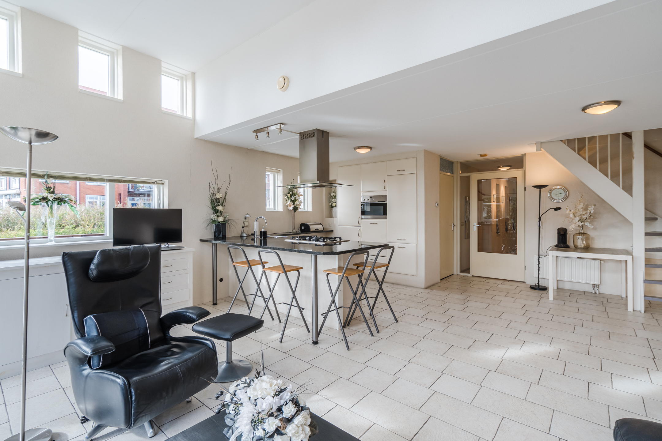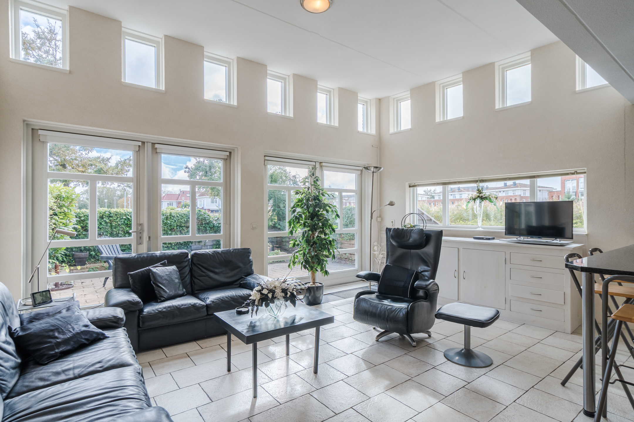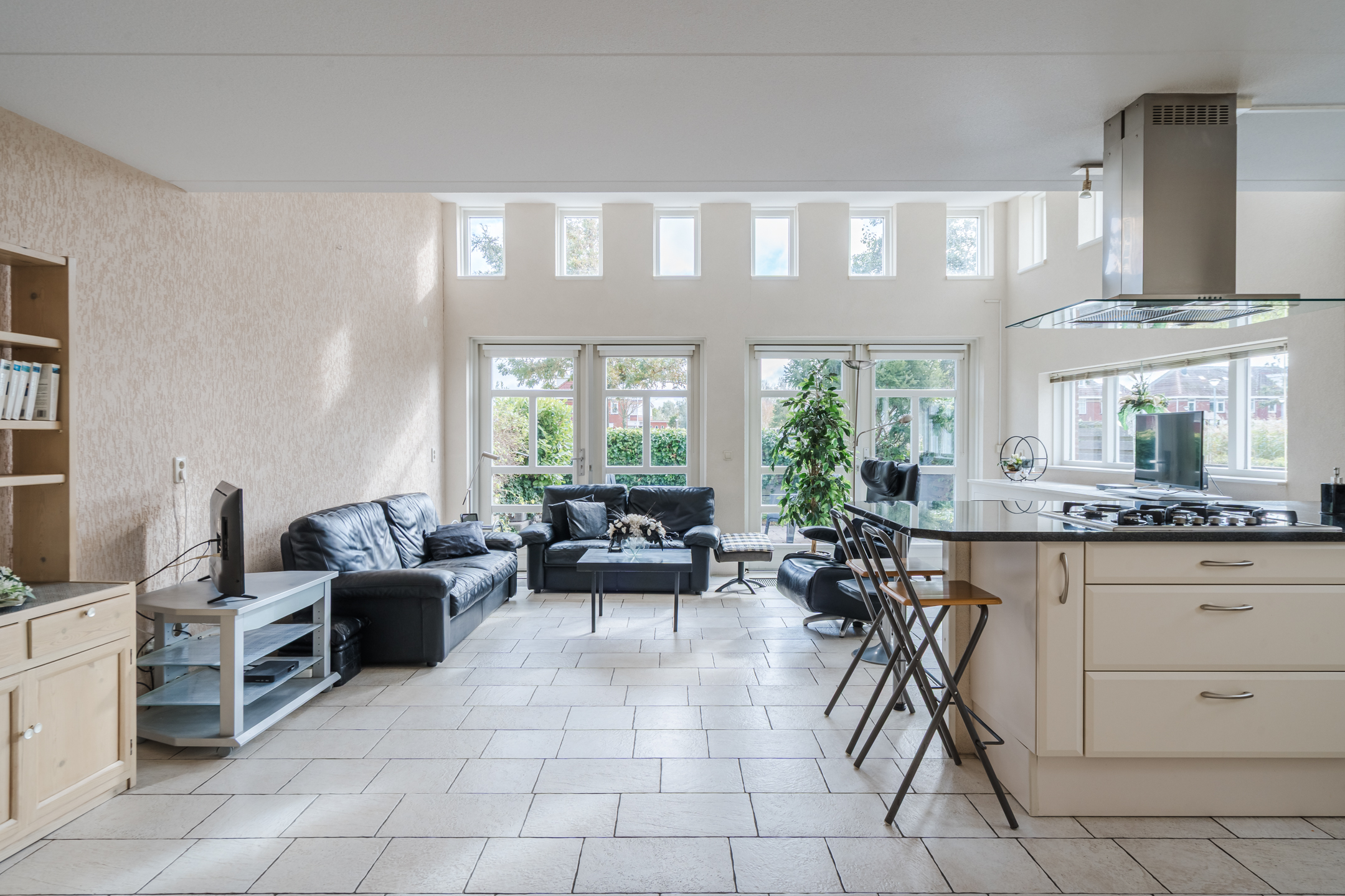 * Hoge plafonds zorgen voor ruimtelijke sfeer;
