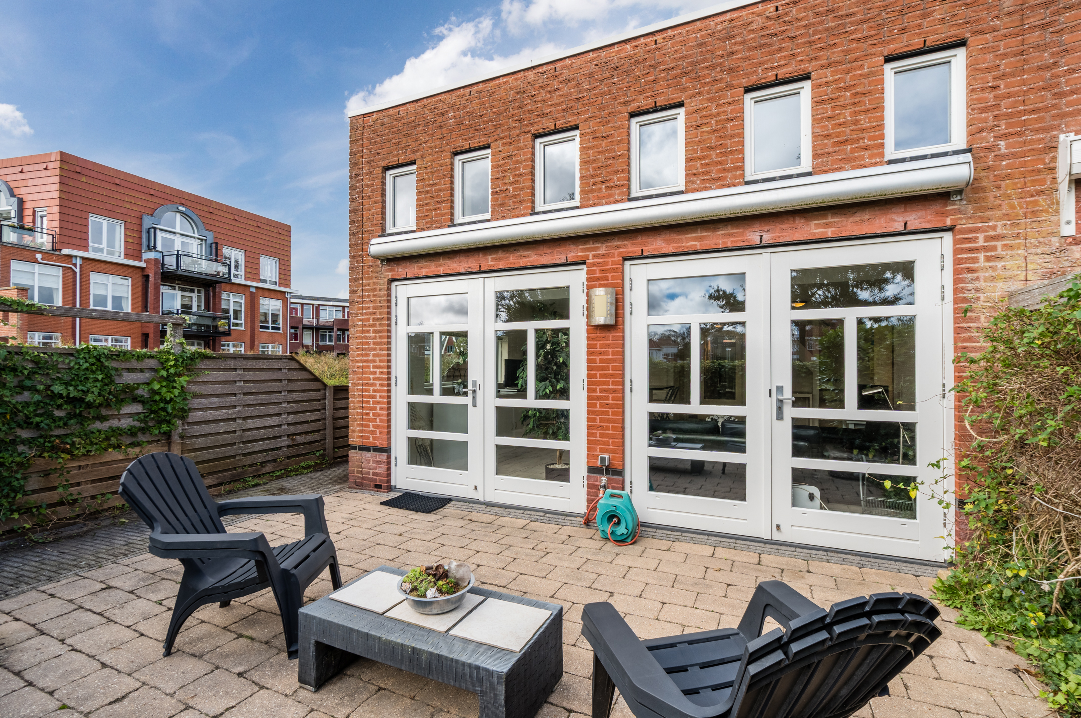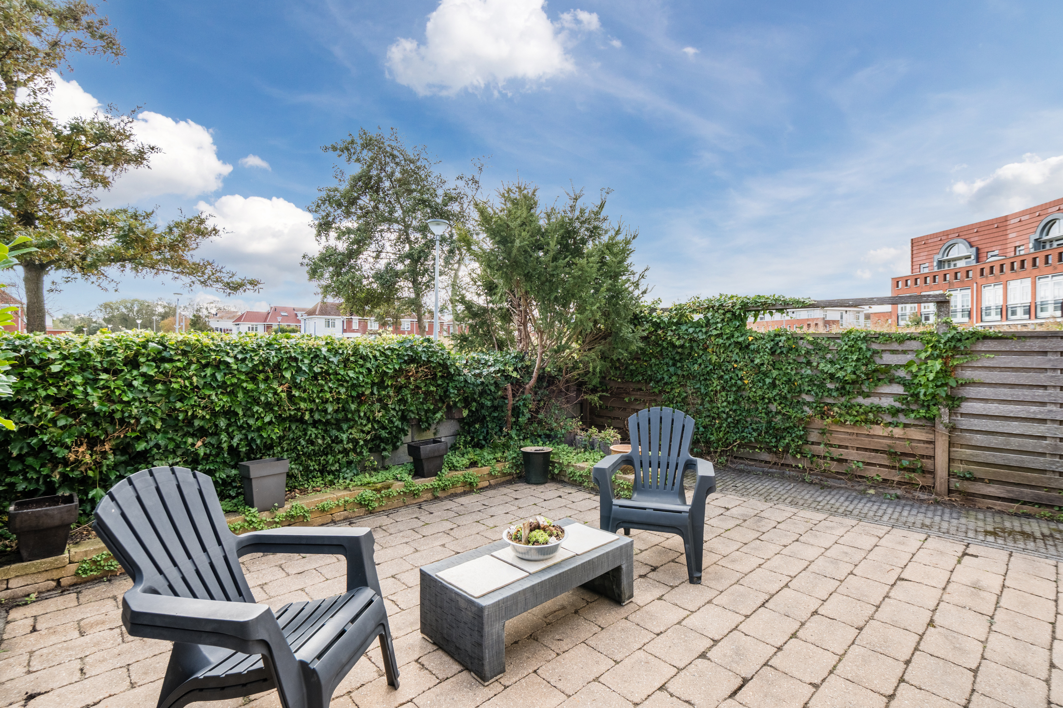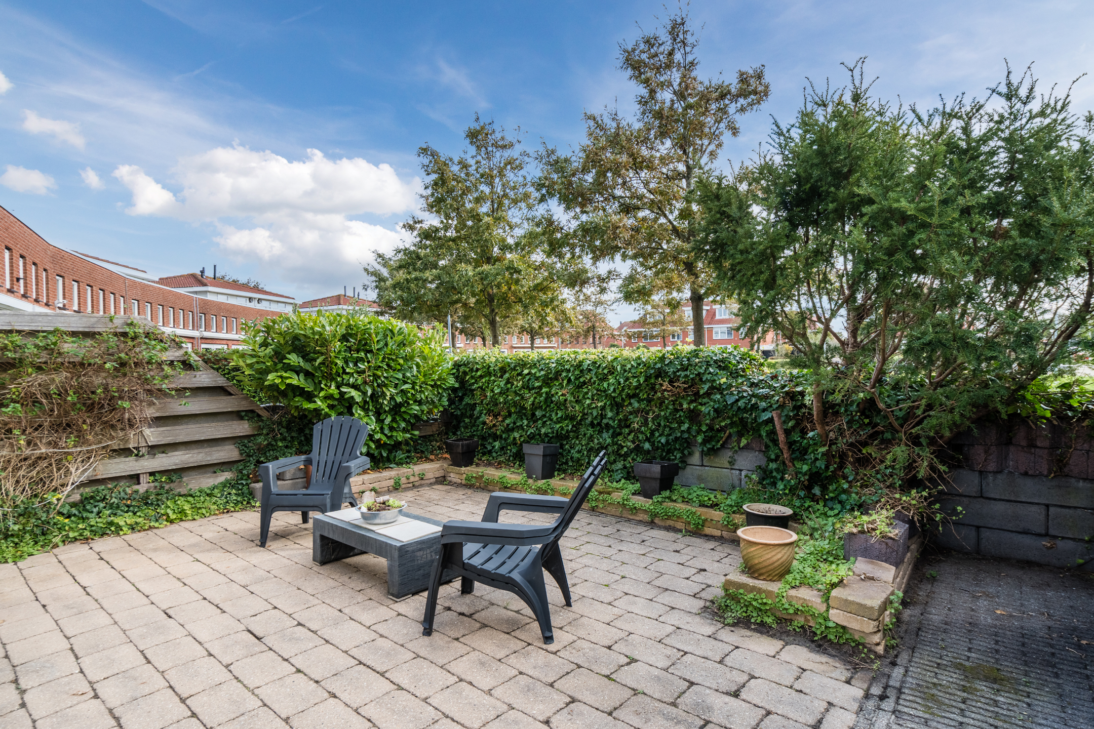 De tuin is onderhoudsvriendelijk en heeft een perfecte zonligging met uitzicht op een plein.