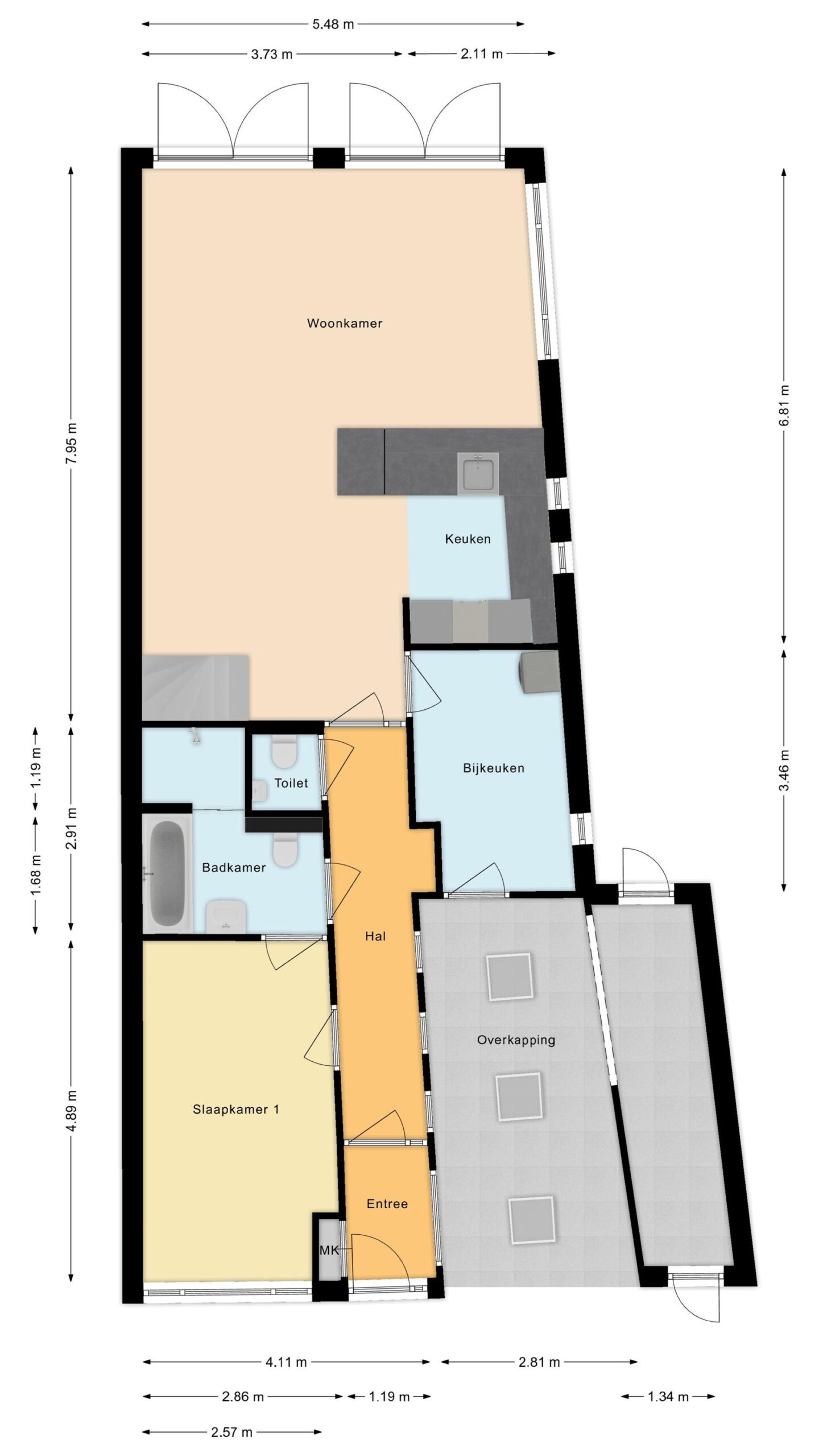 Begane grond: entree, hal, meterkast, slaapkamer met ensuite badkamer, apart toilet, deur naar bijkeuken/berging, woonkamer met open keuken, deur naar tuin, trap naar verdieping.