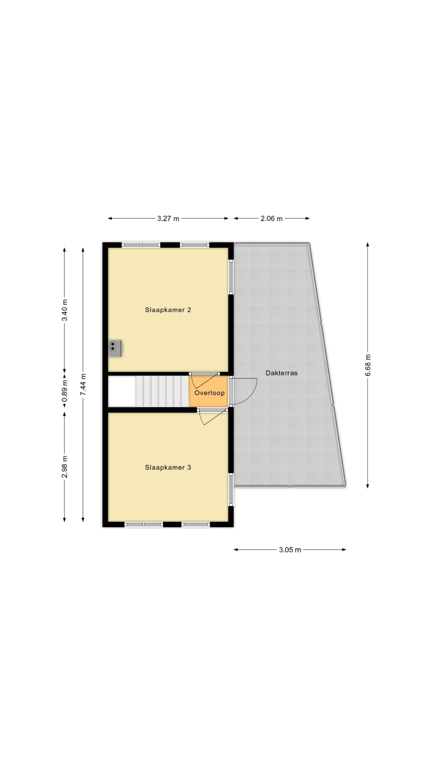 Eerste verdieping: overloop, twee (slaap)kamers, deur naar dakterras.
