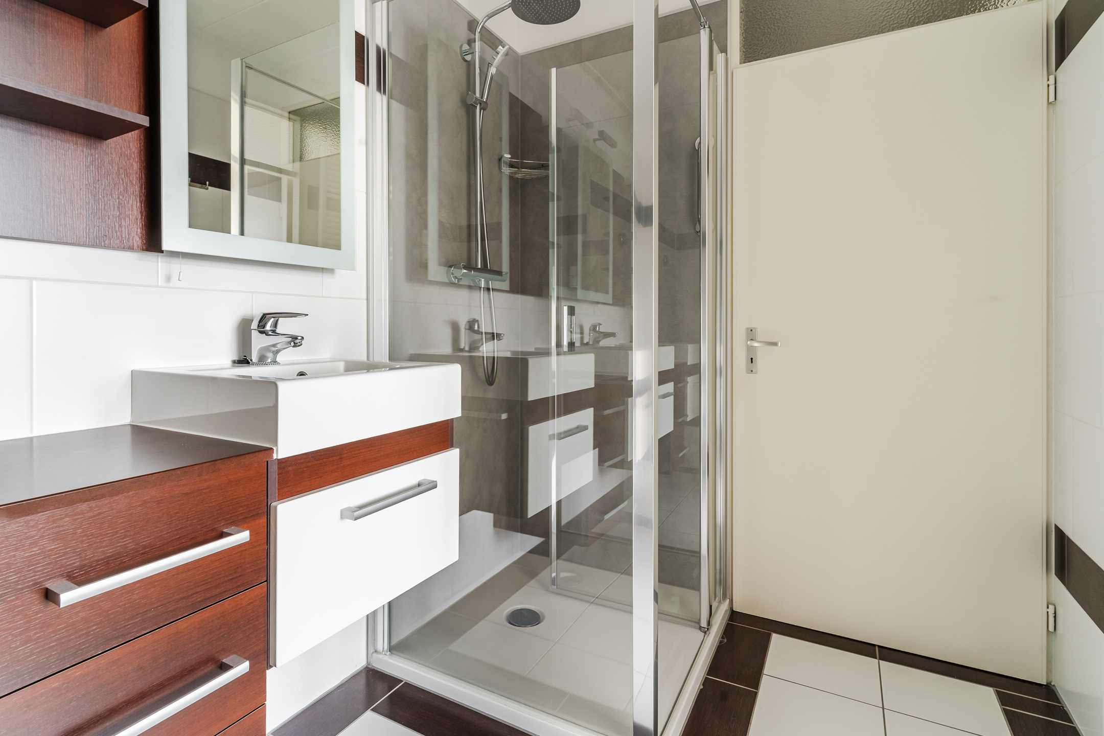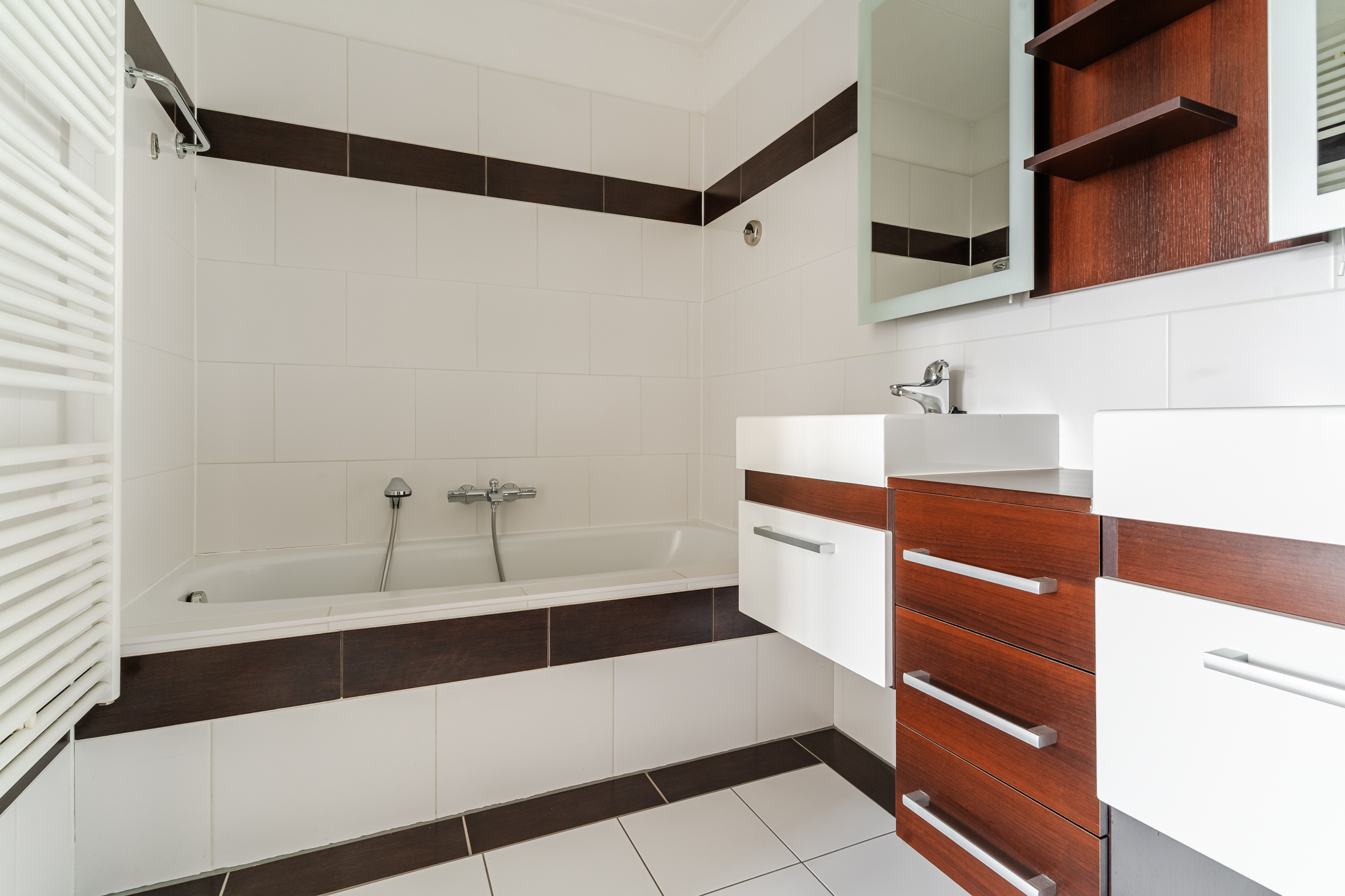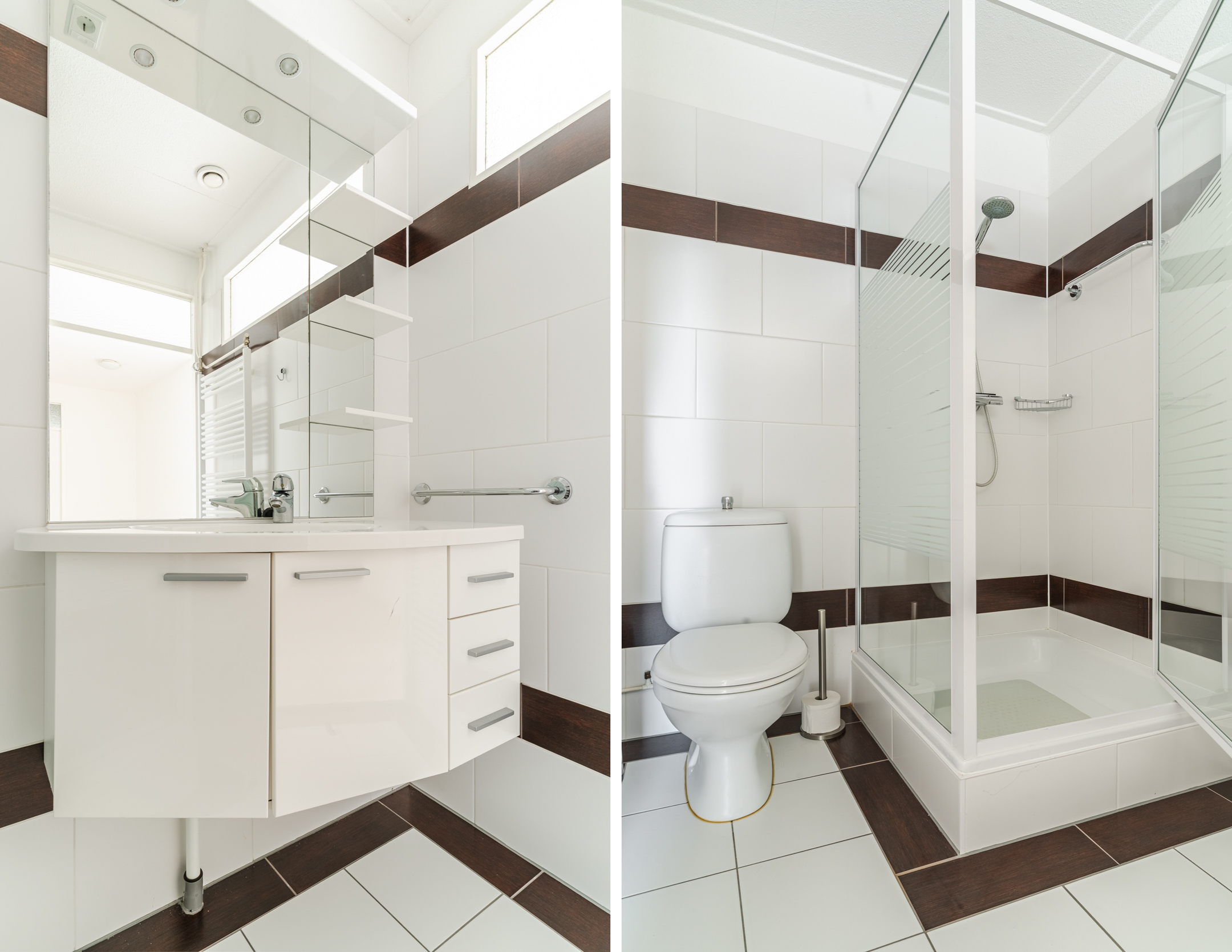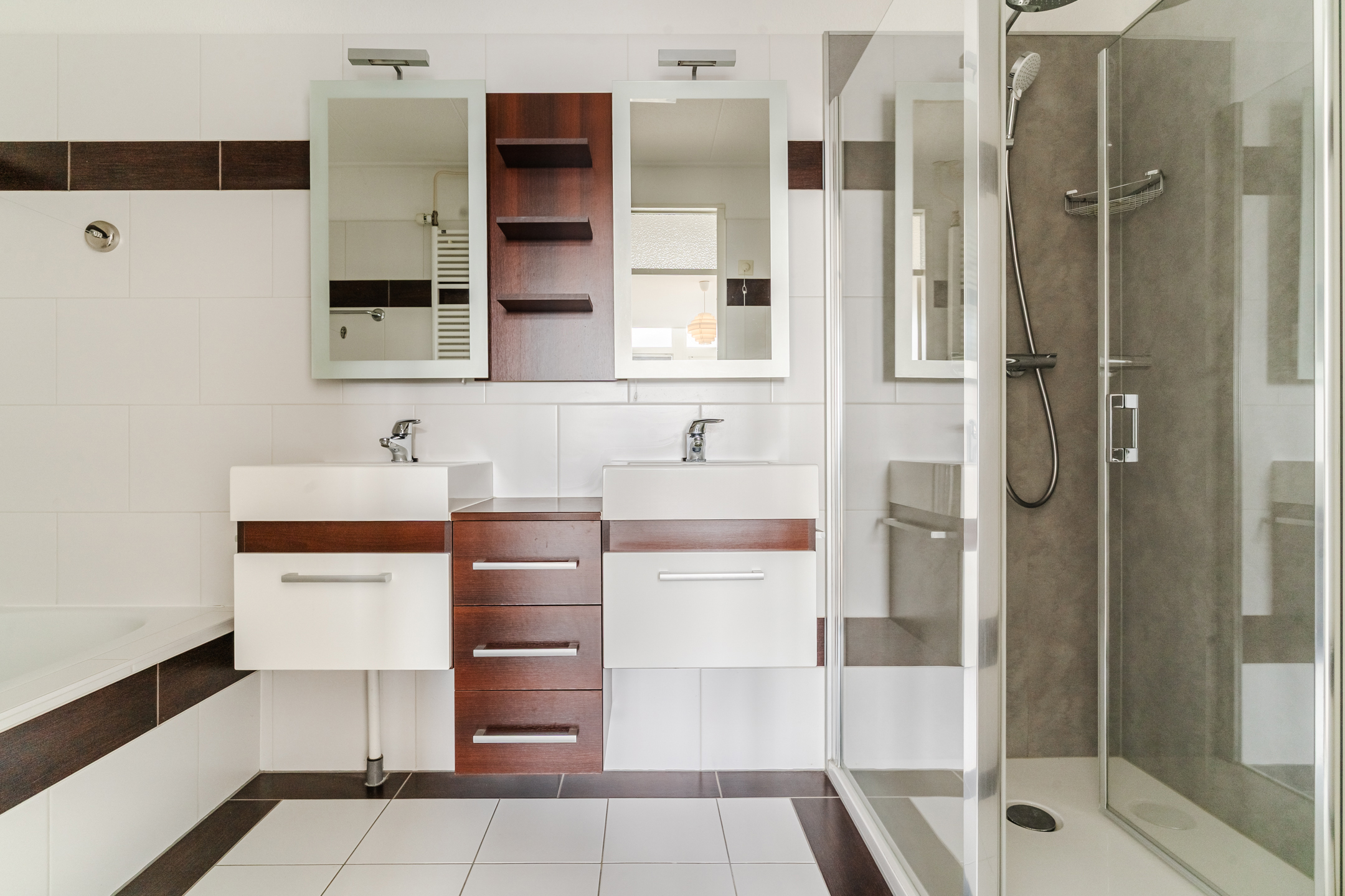 - Badkamervoorzieningen Ligbad, douche, dubbele wastafel, wastafelmeubel, toilet, douche, wastafel
