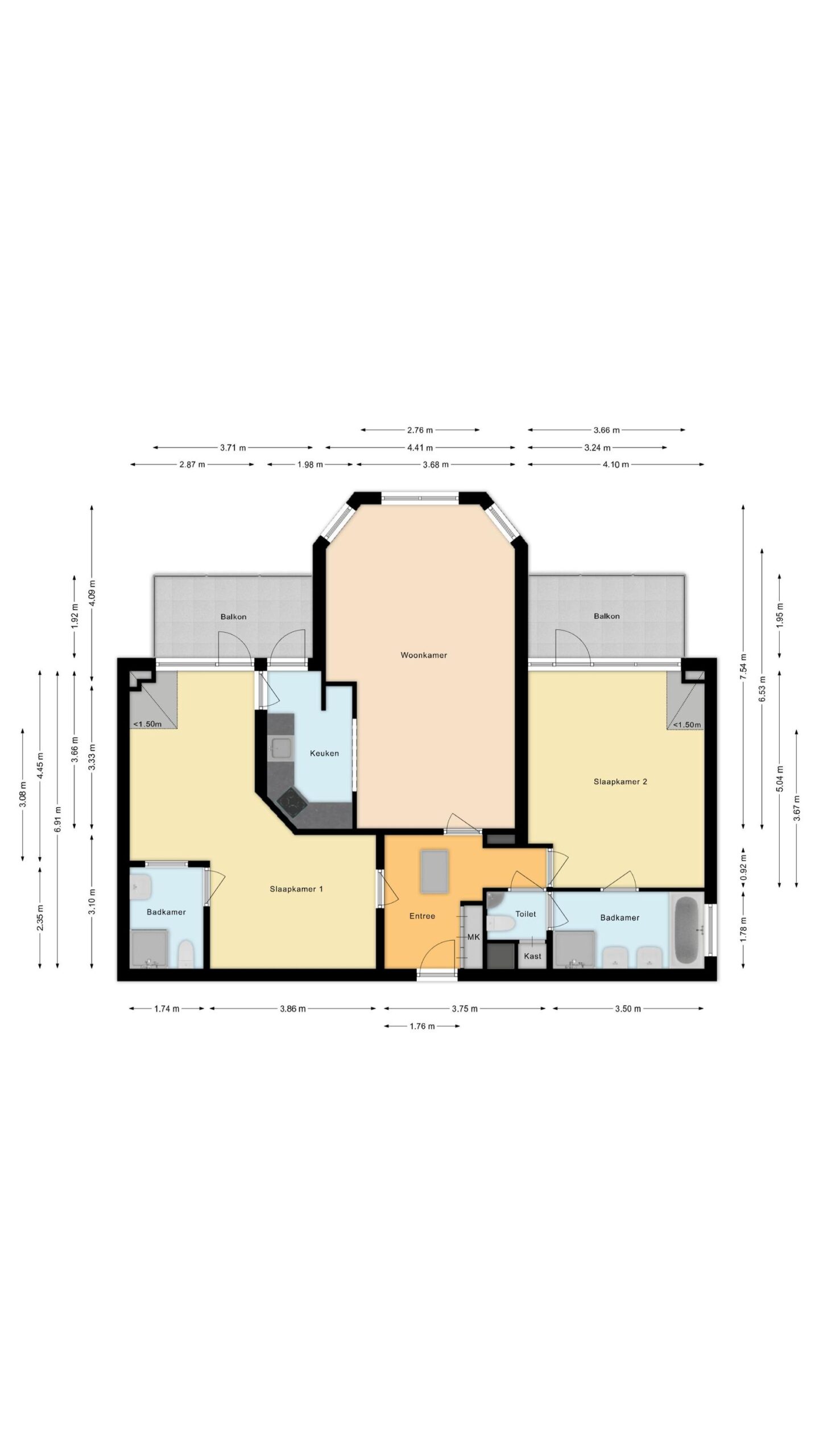 3e verdieping: entree appartement, hal met vlizotrap naar bergvliering, meterkast, separaat toilet, woonkamer, open keuken, 2 slaapkamers, 2 badkamers, 2 balkons;