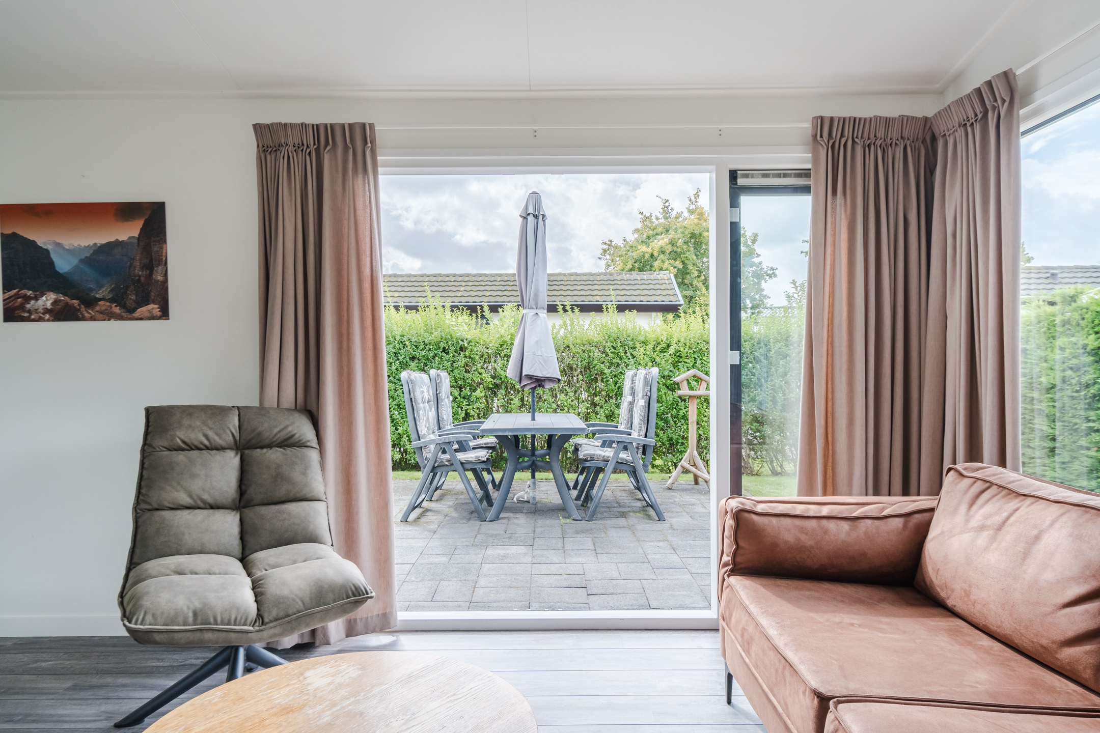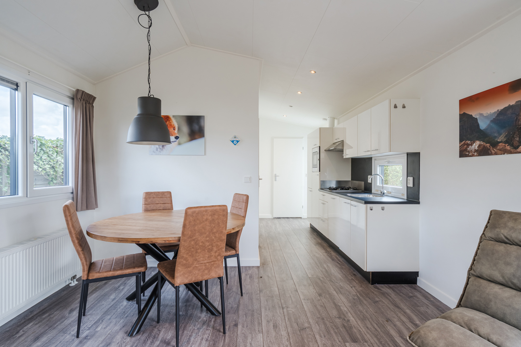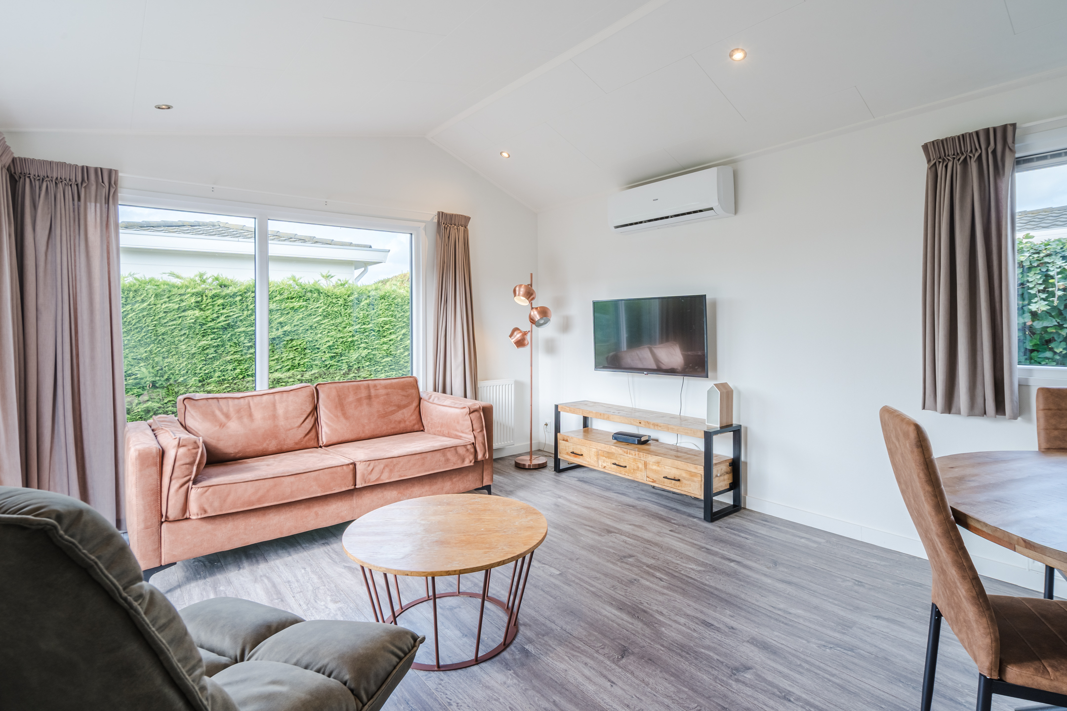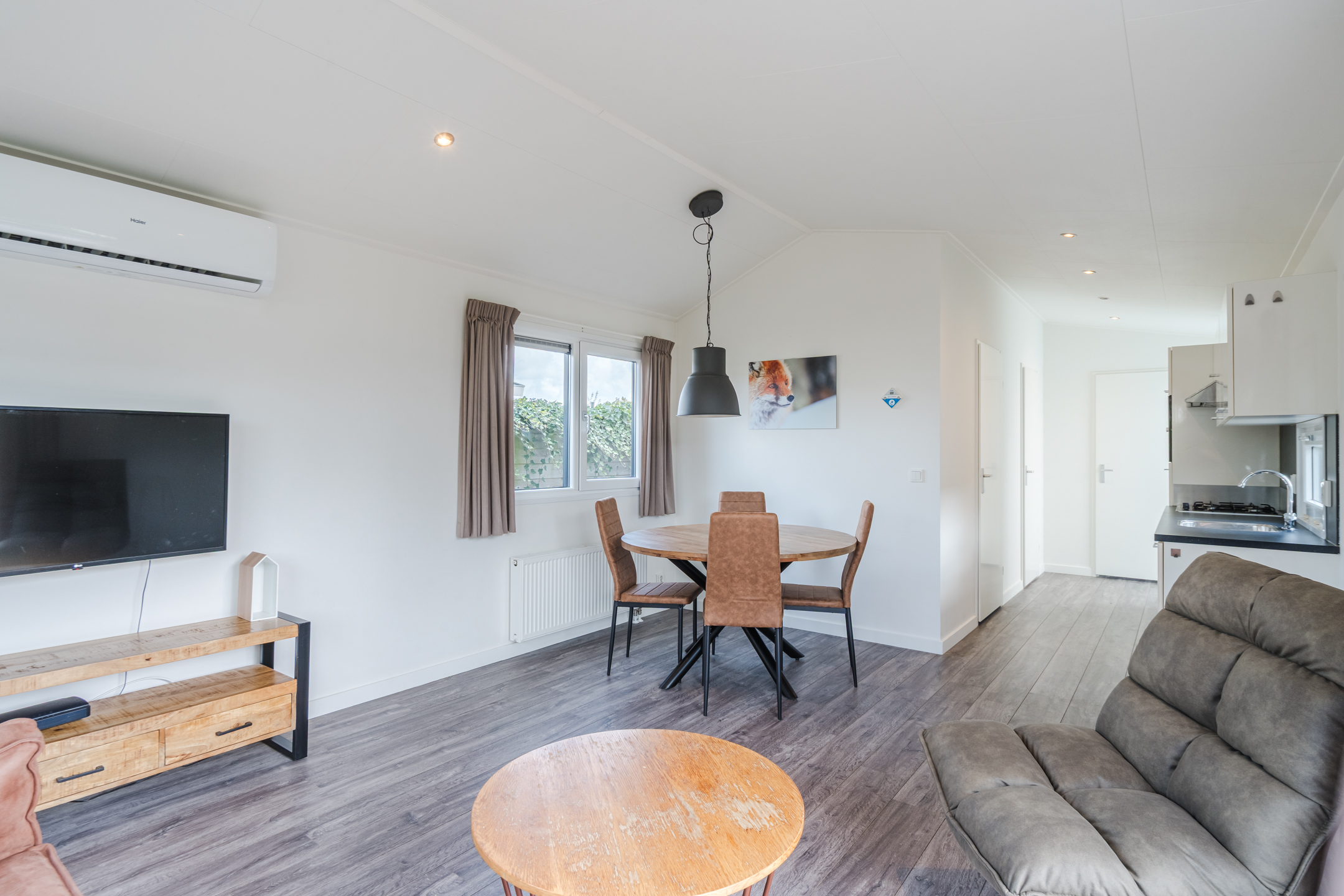 Het chalet is gezellig ingericht en beschikt over een lichte woonkamer met airco die zowel kan verwarmen als verkoelen en een open keuken, voorzien van inbouwapparatuur. Er zijn twee slaapkamers met in totaal vier slaapplaatsen. De badkamer is compact en praktisch ingericht. De onderhoudsarme kunststof gevels en kozijnen zorgen voor een lange levensduur. De tuin ligt op het zuidwesten, gunstig voor zonliefhebbers.