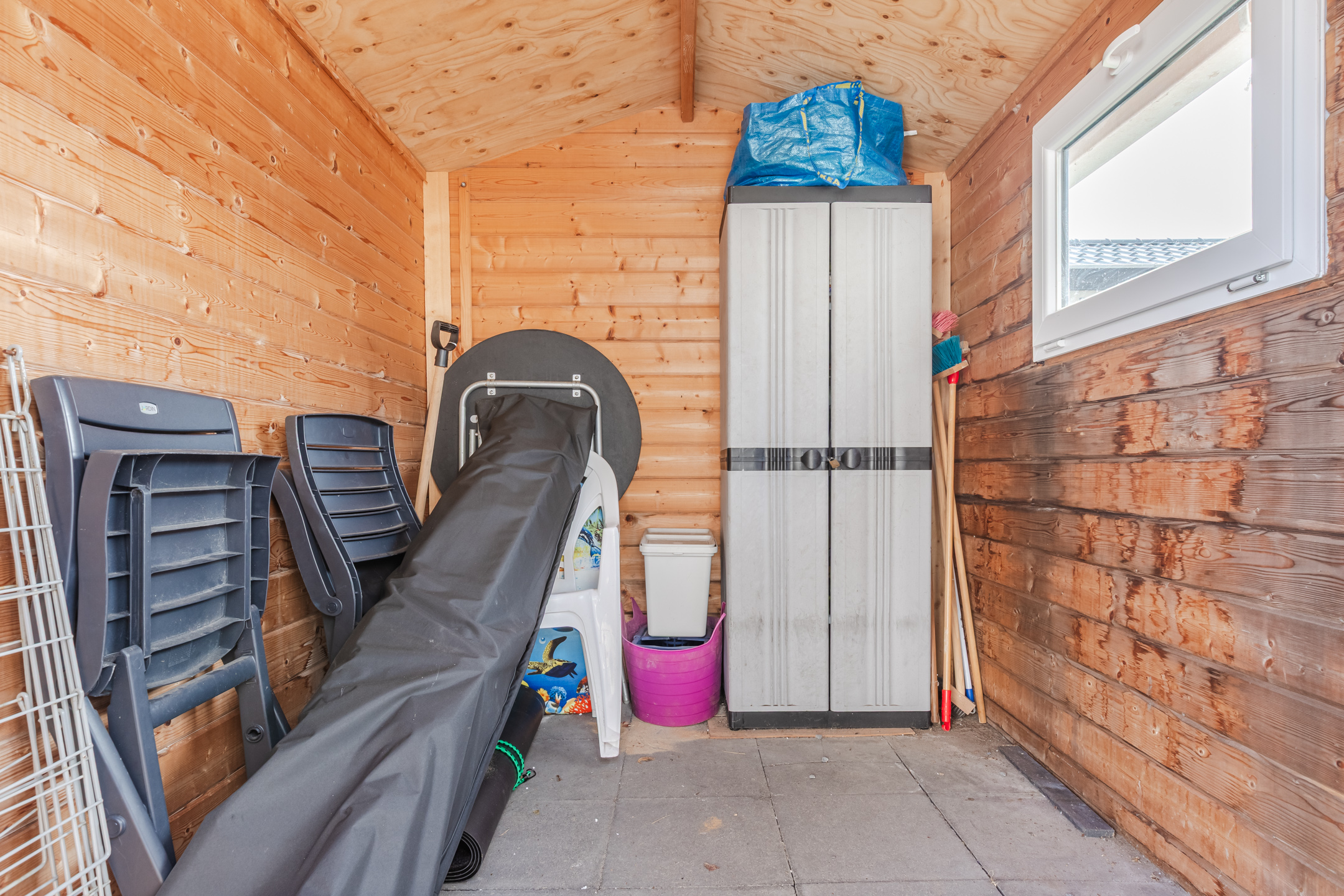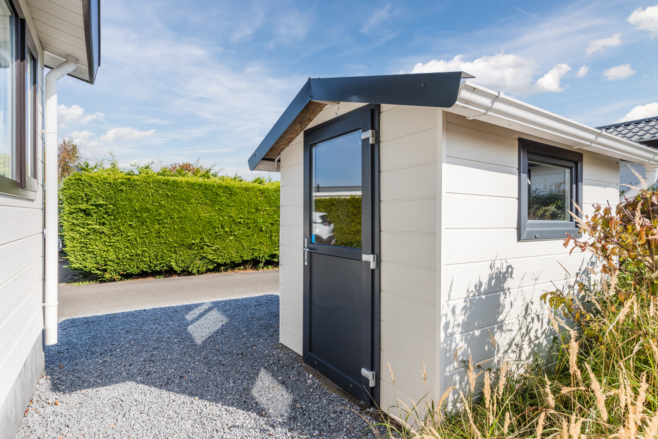 Het chalet zelf is onderhoudsvriendelijk uitgevoerd met kunststof bekleding (in 2022 volledig vernieuwd, evenals de schuurbekleding) en verrassend licht dankzij de vele ramen en openslaande deuren naar de zonnige tuin op het zuiden. Binnen vindt u een sfeervolle woonkamer, nette keuken, twee slaapkamers en een badkamer. Verder beschikt het perceel over een eigen parkeerplaats en berging.