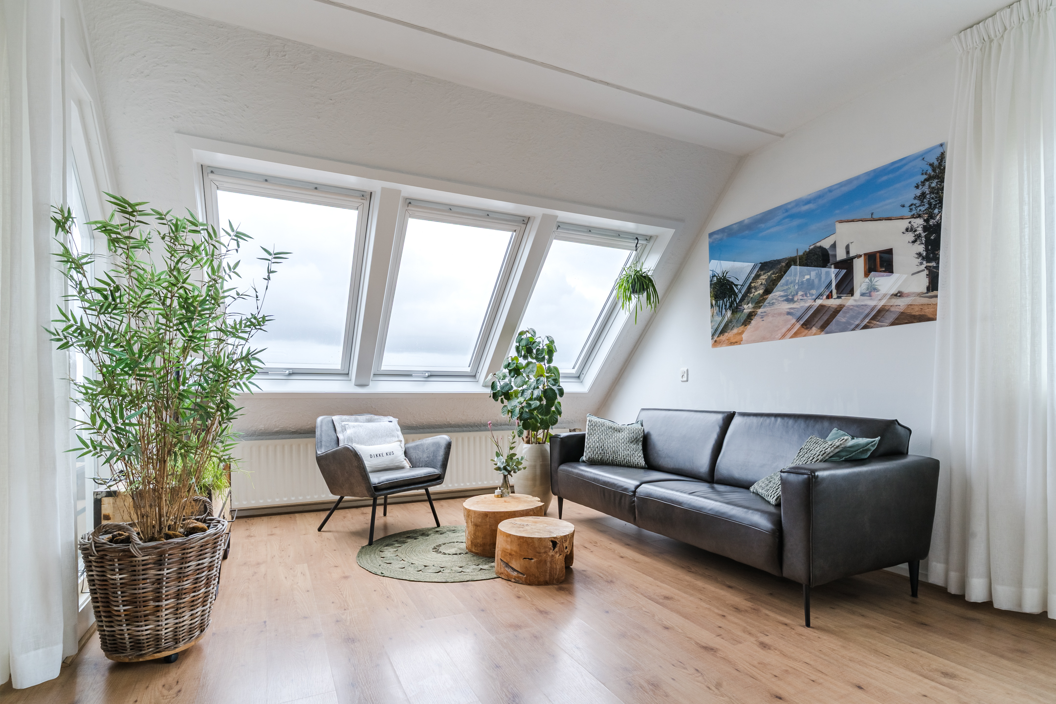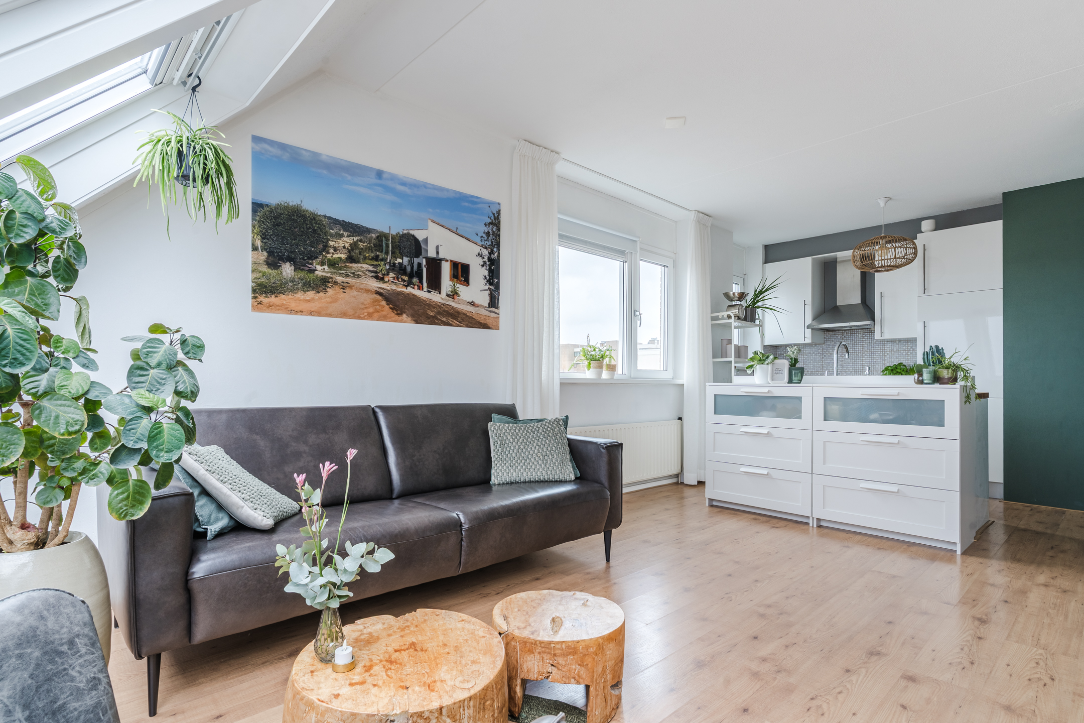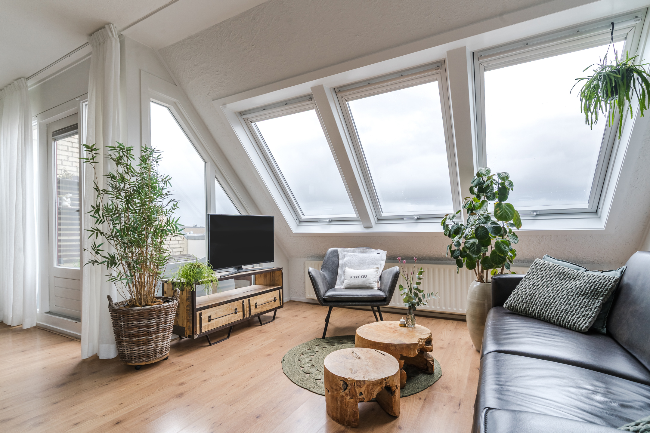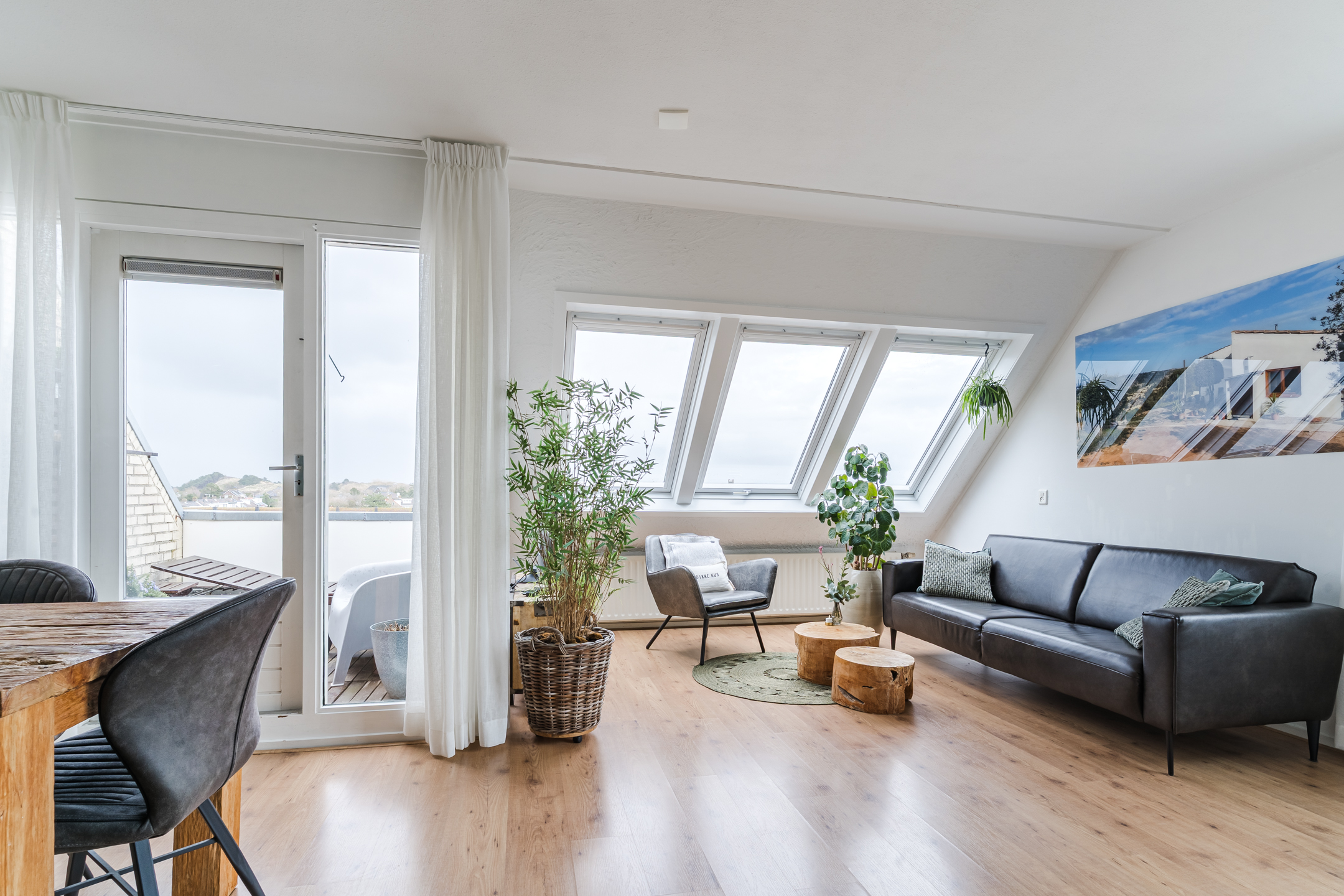 Heerlijk lichte woonkamer dankzij de grote dakvensters en een deur naar het balkon op het oosten;