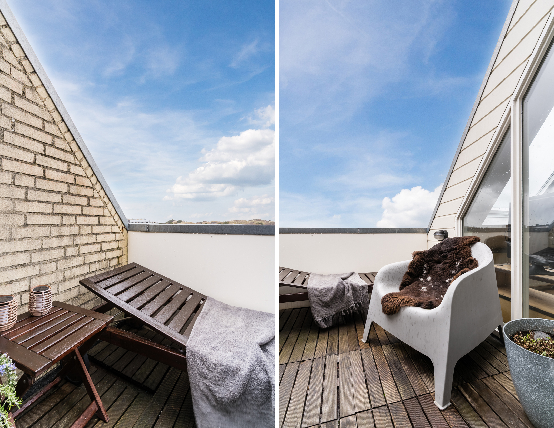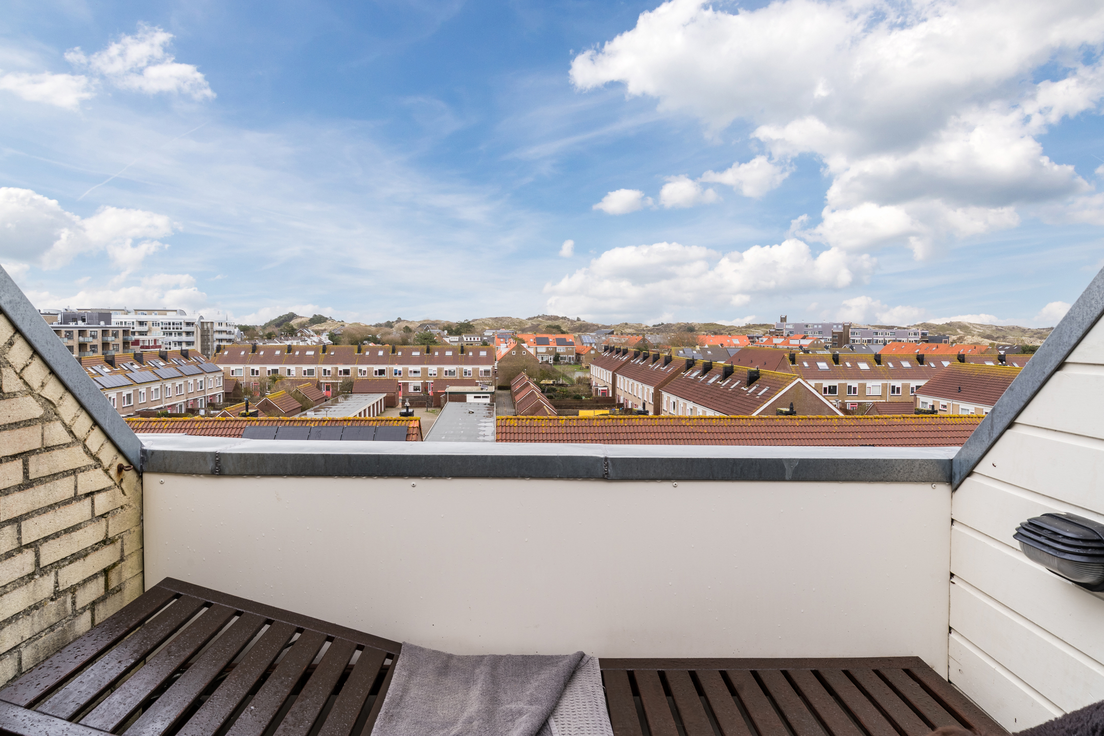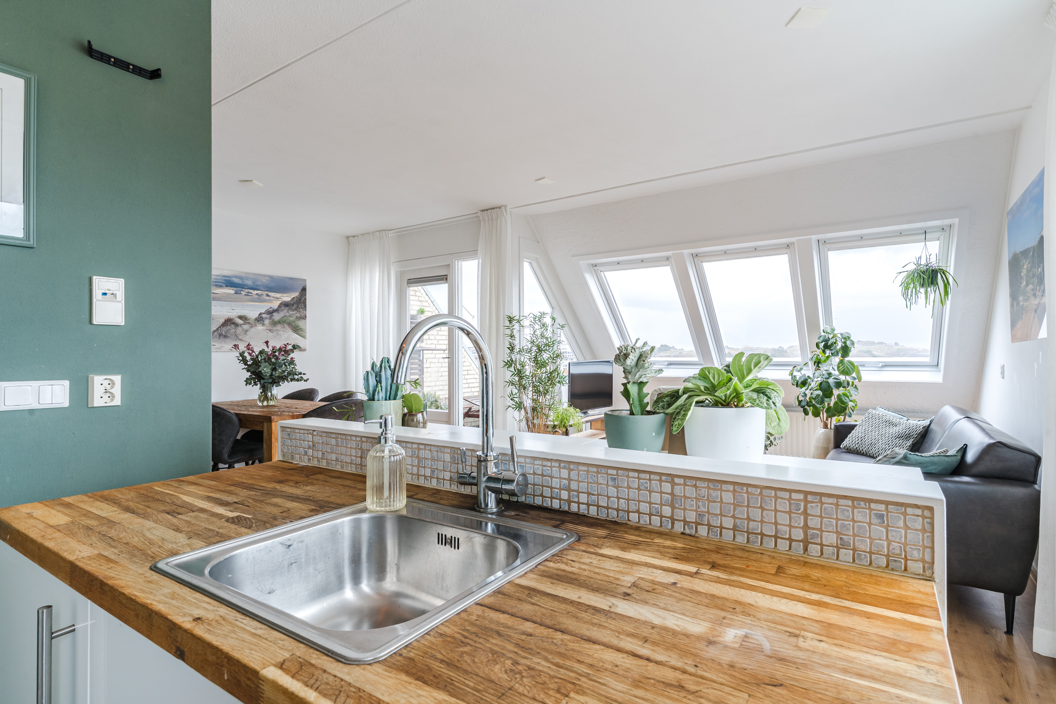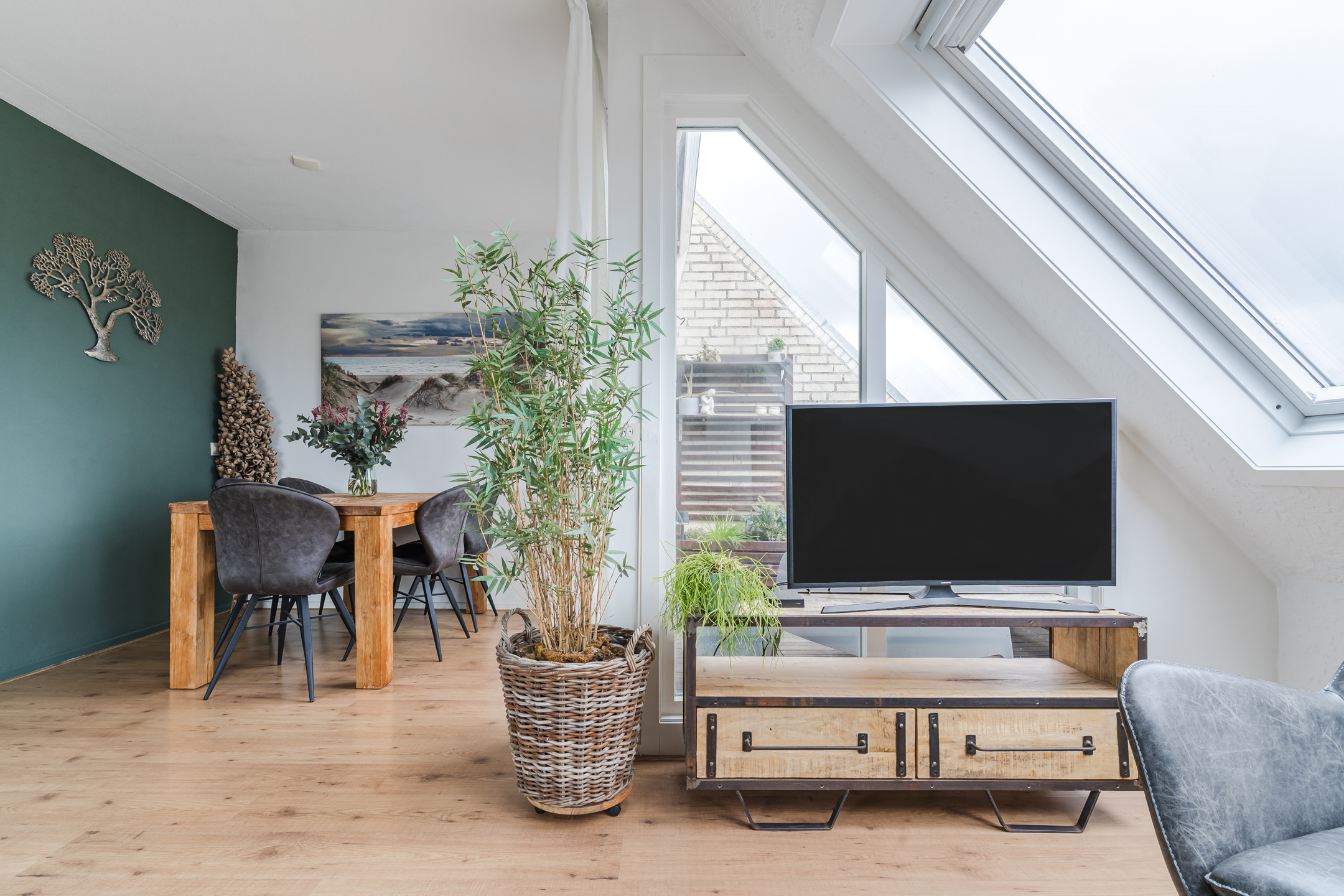 Heerlijk lichte woonkamer dankzij de grote dakvensters en een deur naar het balkon op het oosten;