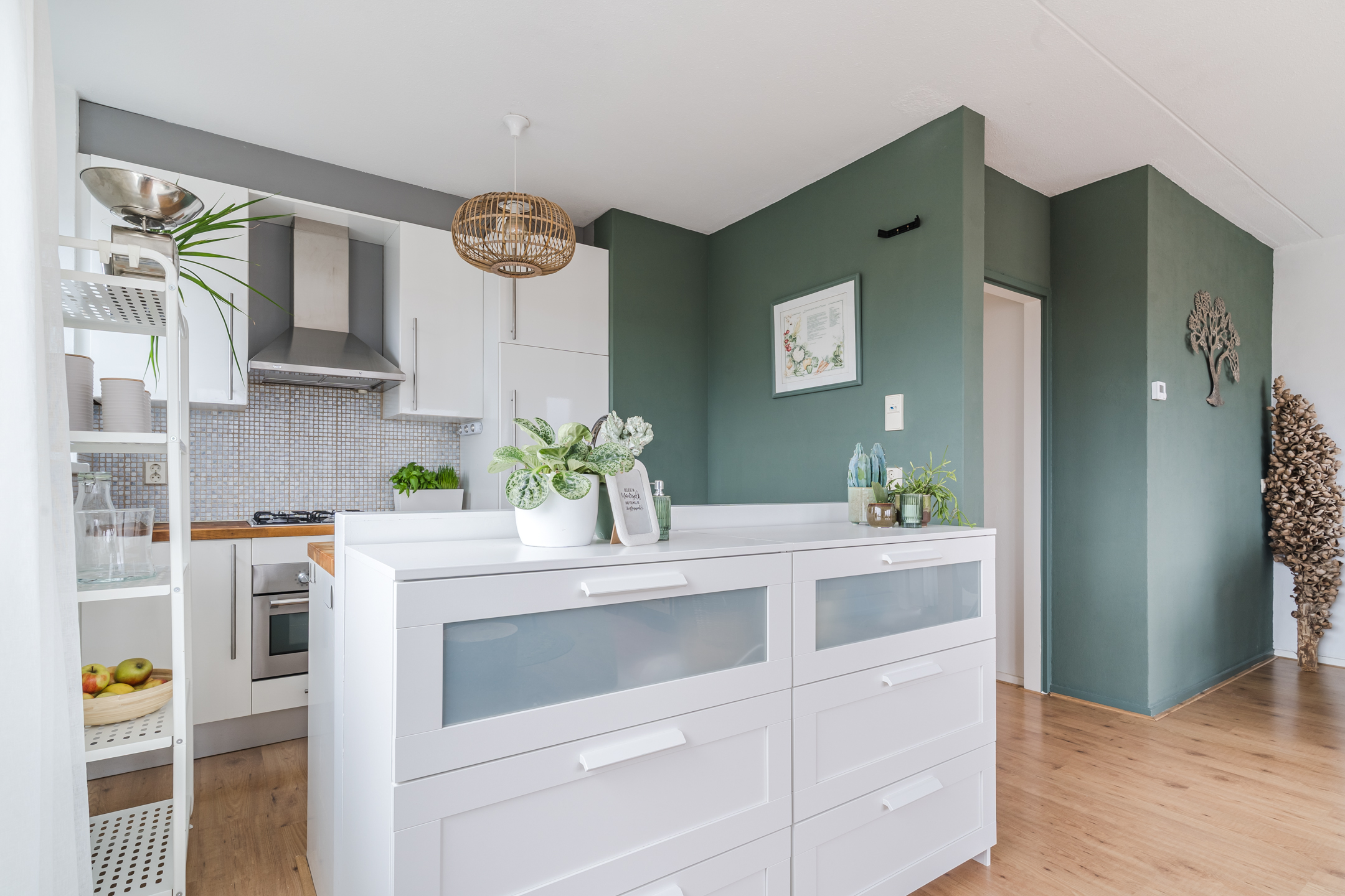 Open keuken met modern ‘nat eiland’, compleet uitgerust met koelkast, kookplaat en combi-magnetron;