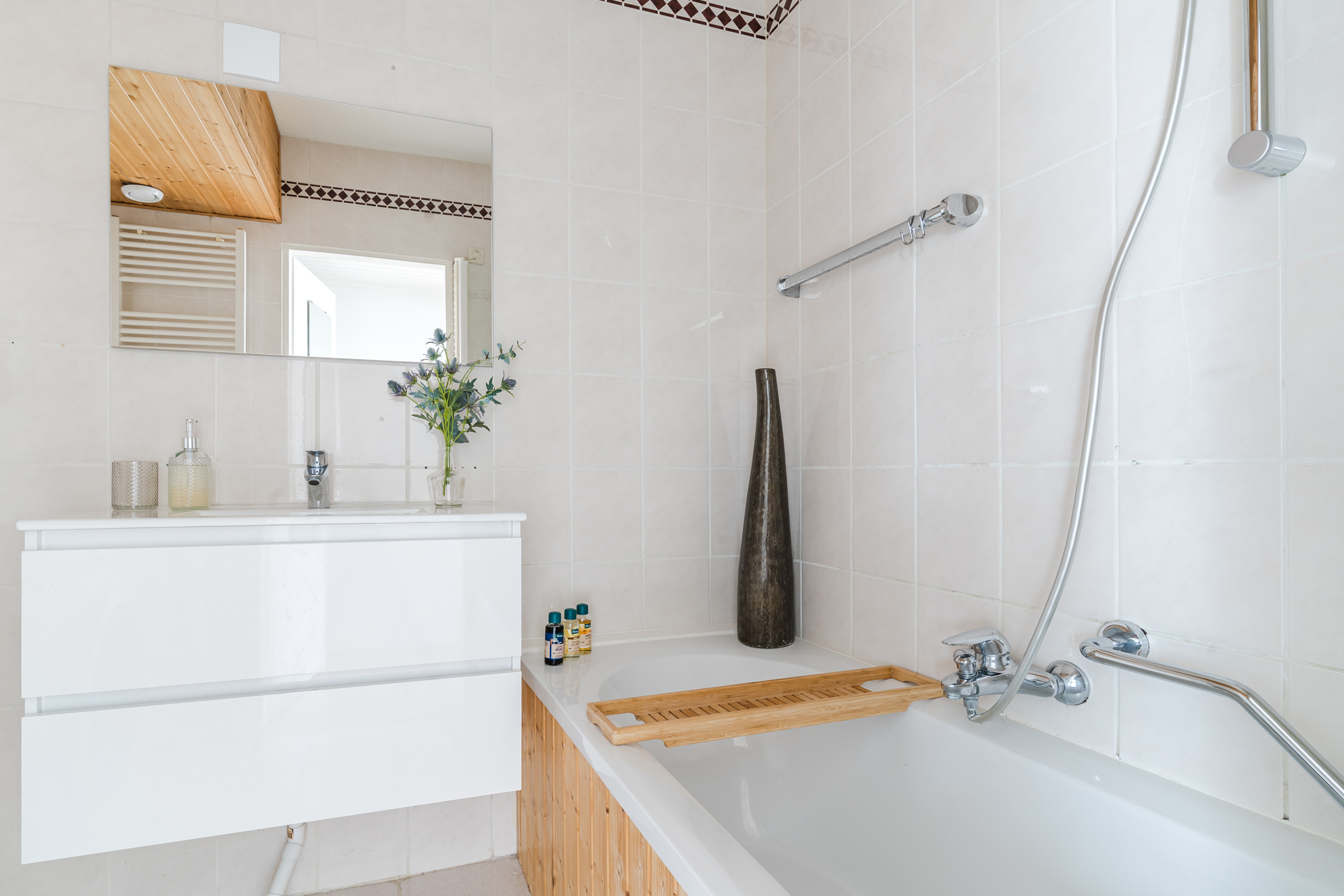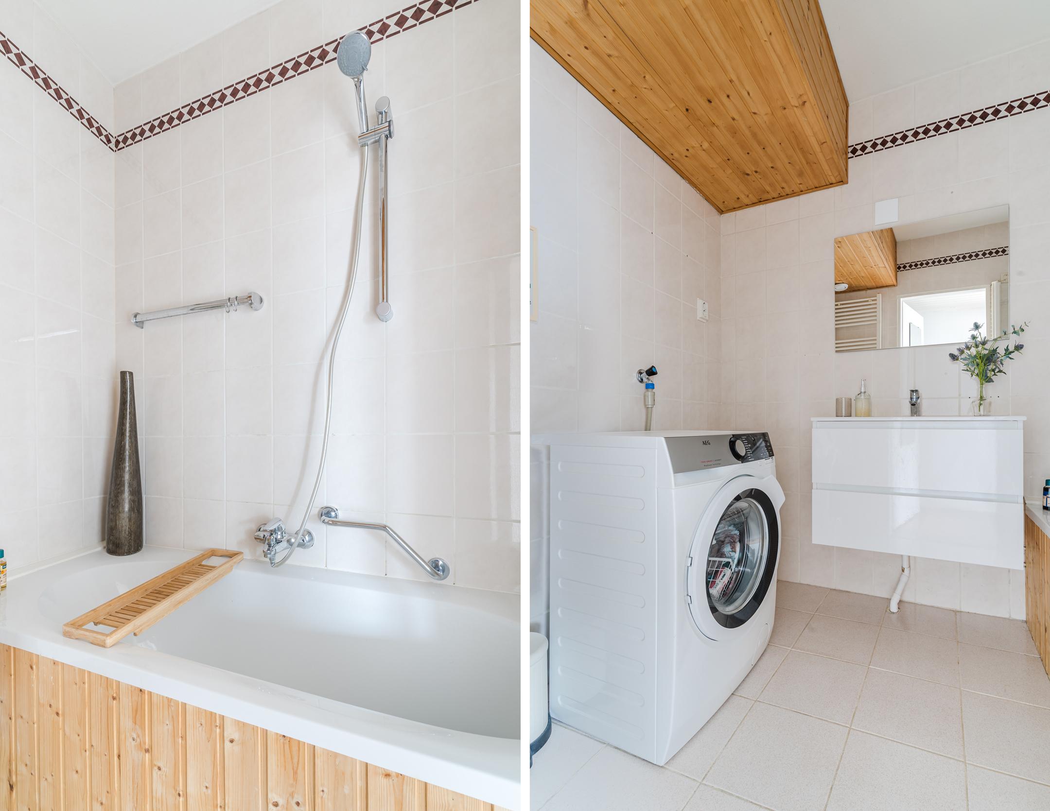 Stijlvolle badkamer met ligbad, wastafelmeubel en aansluiting voor de wasmachine;