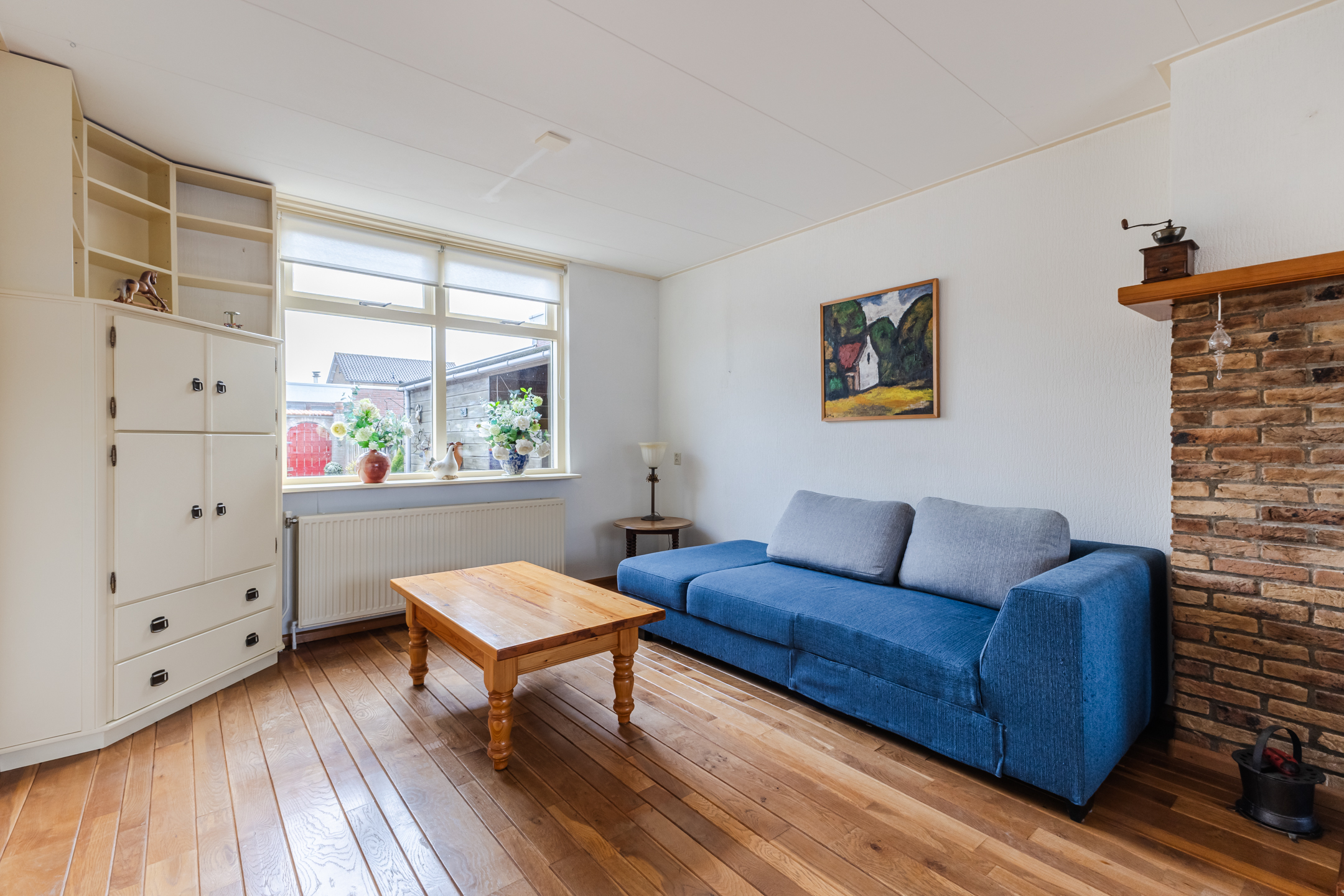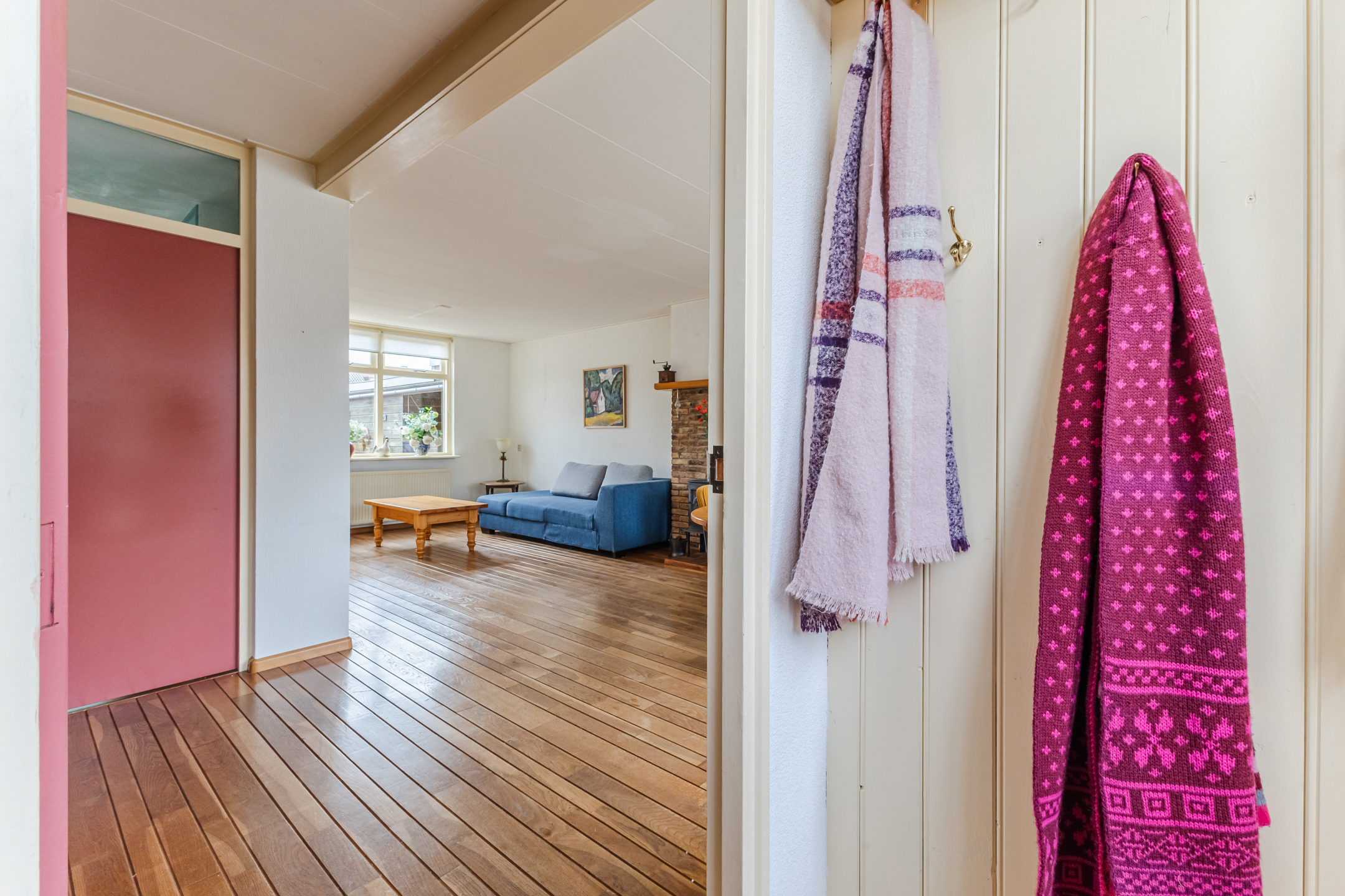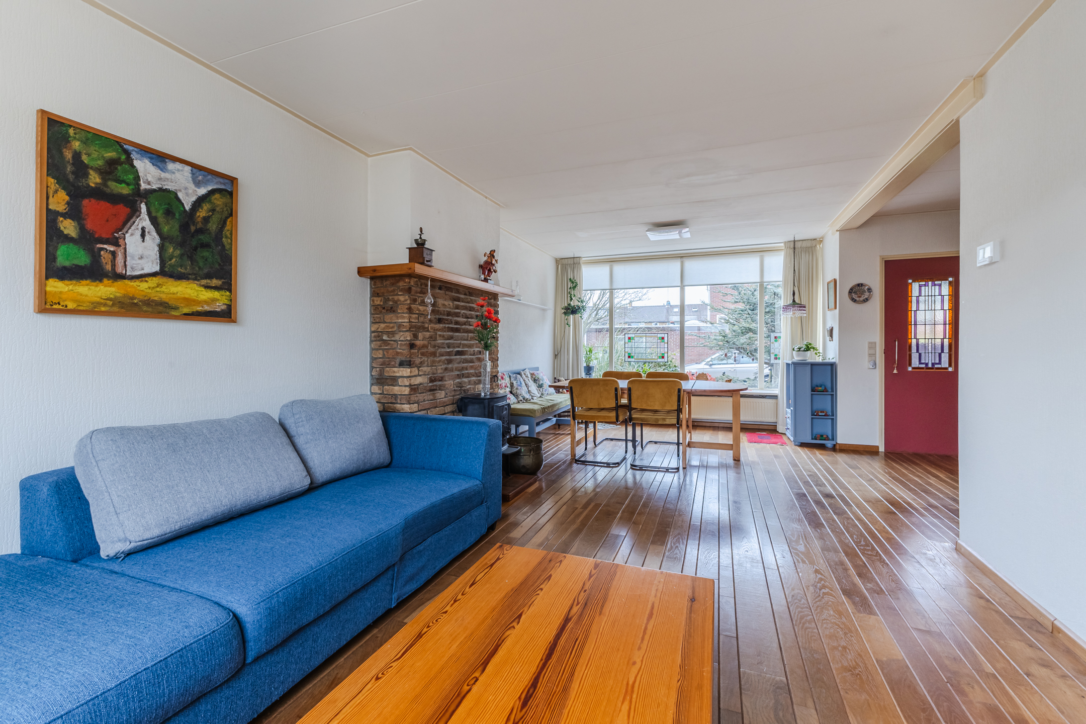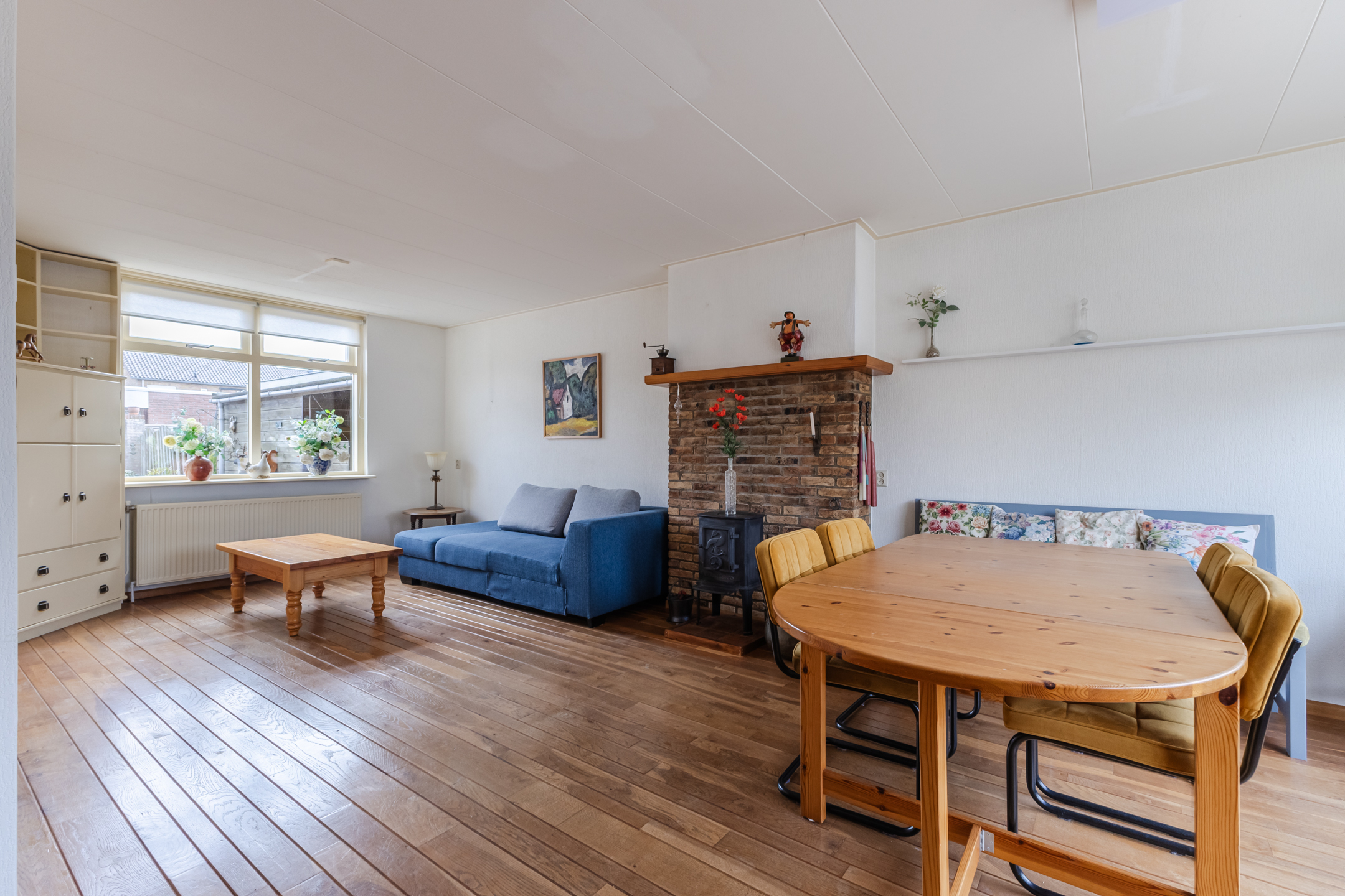 De woning biedt verrassend veel leefruimte en heeft een prettige indeling. Via de entree en hal bereik je de royale woonkamer, die dankzij de brede beukmaat heerlijk ruim aanvoelt. De houten vloer en de aanwezigheid van een houtkachel zorgen voor een warme en sfeervolle uitstraling.