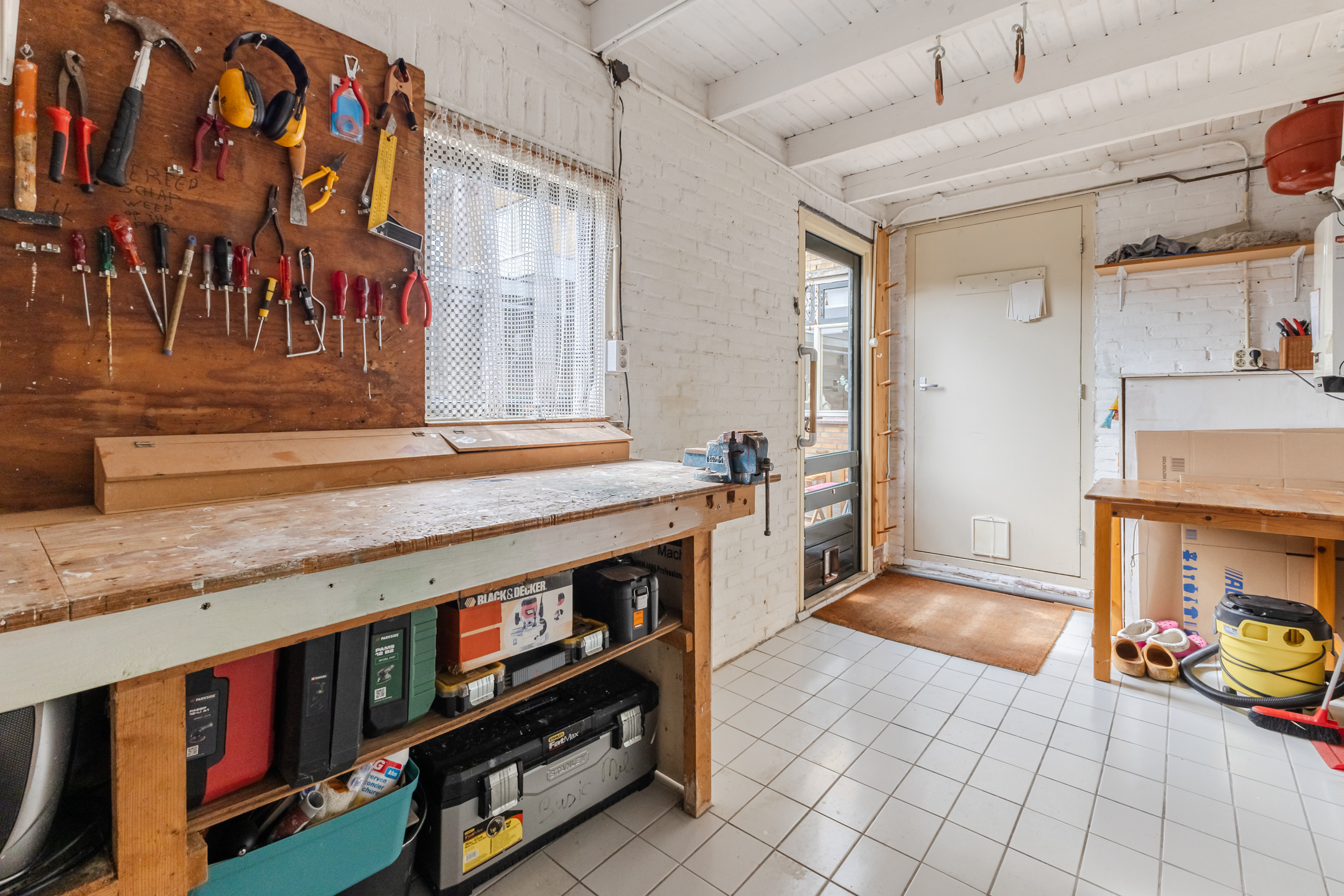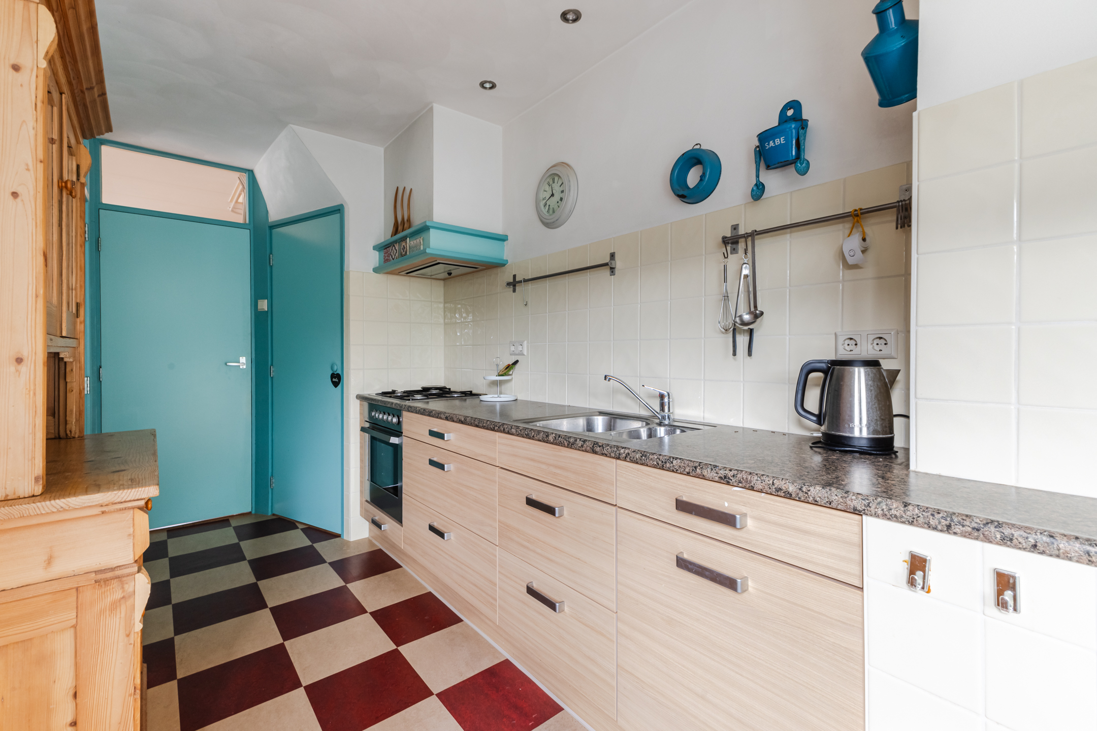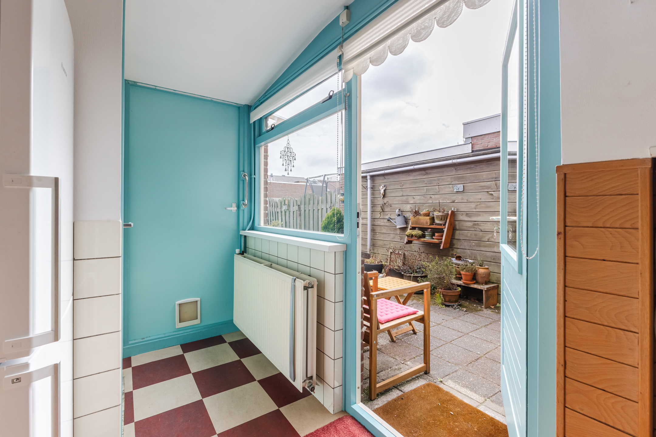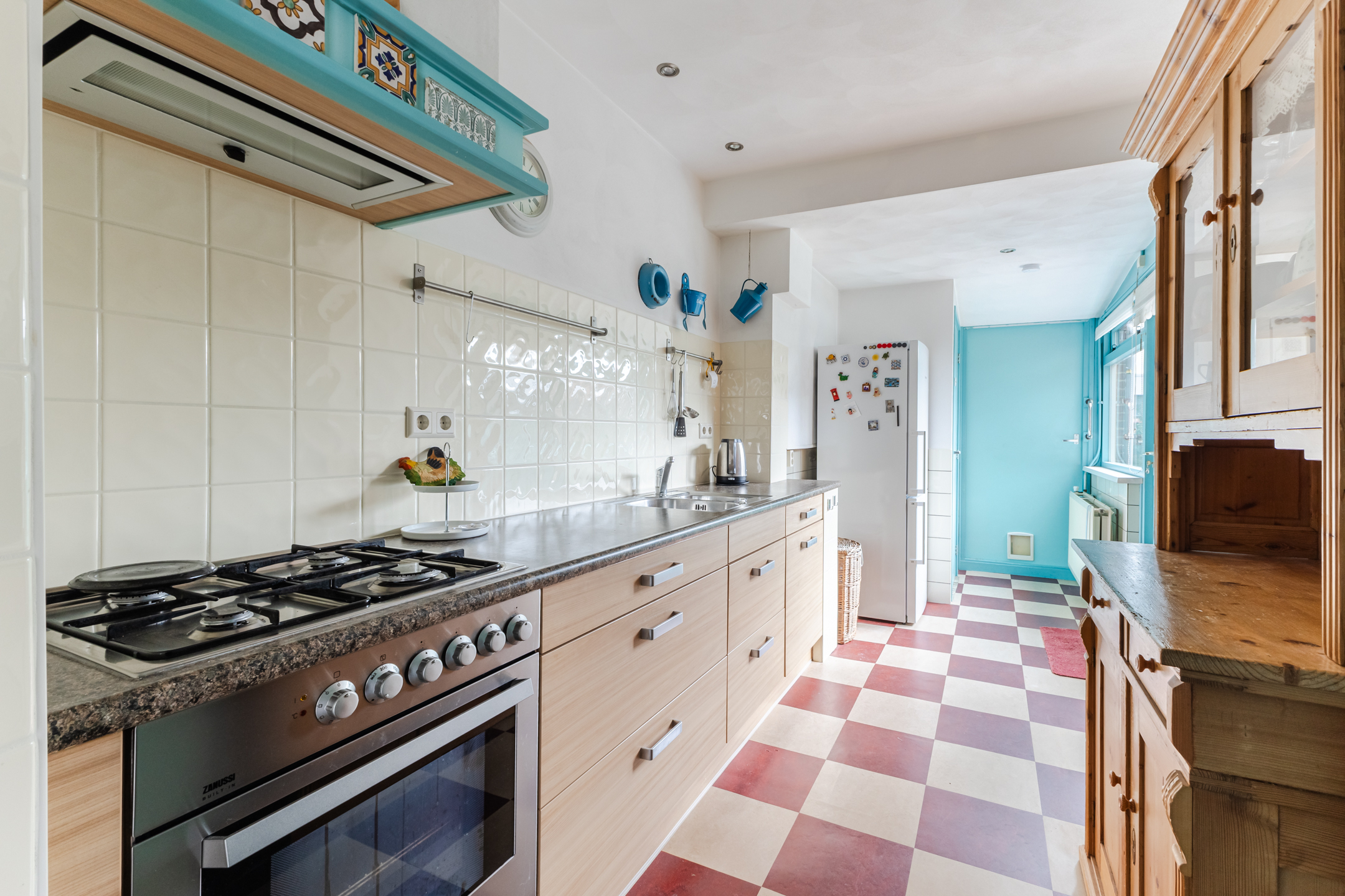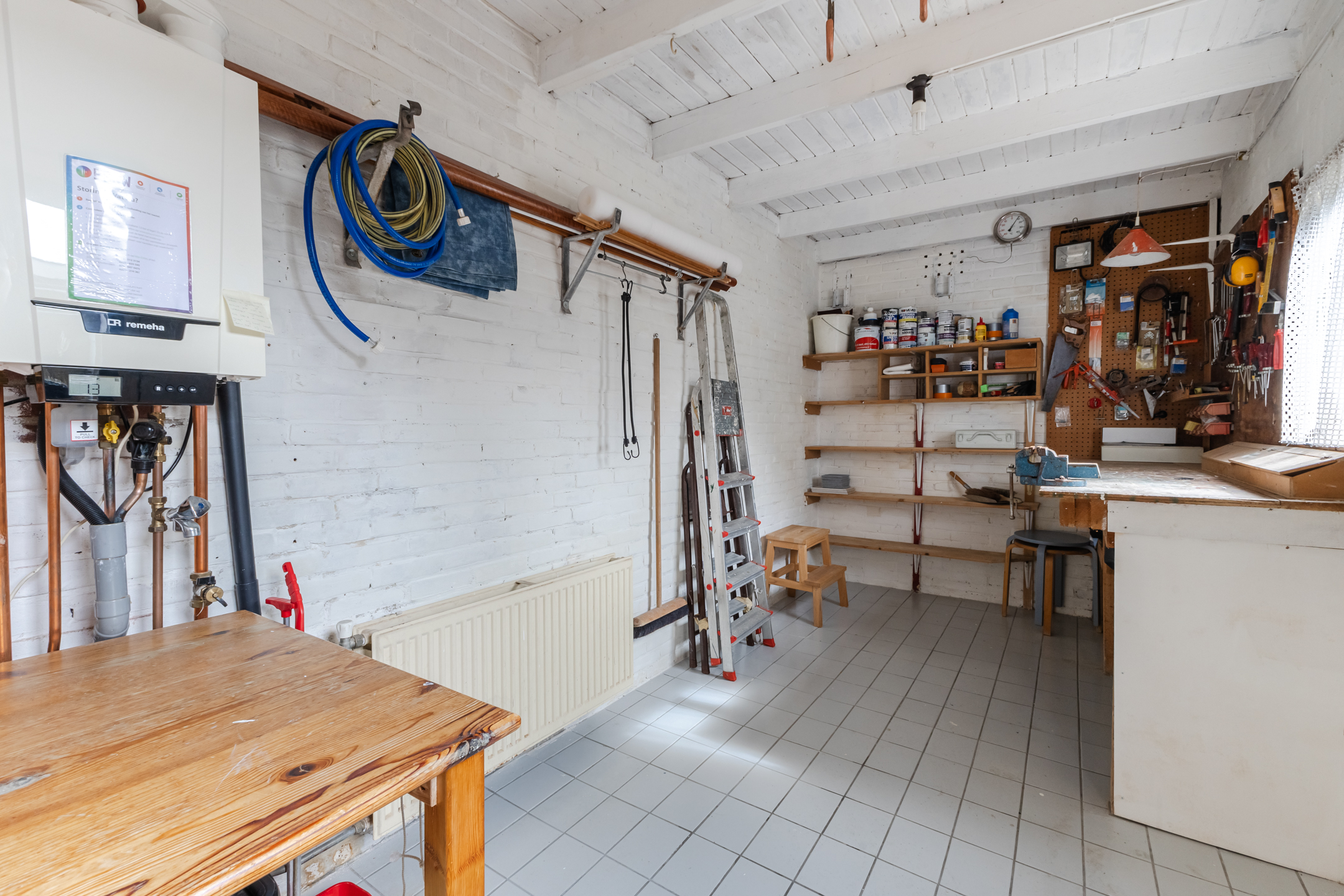 De dichte keuken beschikt over enkele inbouwapparatuur, een was-/droogaansluiting en geeft toegang tot de toiletruimte. Aansluitend vind je de praktische bijkeuken, ideaal als klusruimte en voor extra opslag. Hier bevindt zich tevens de CV-ketel (Remeha, 2018).
