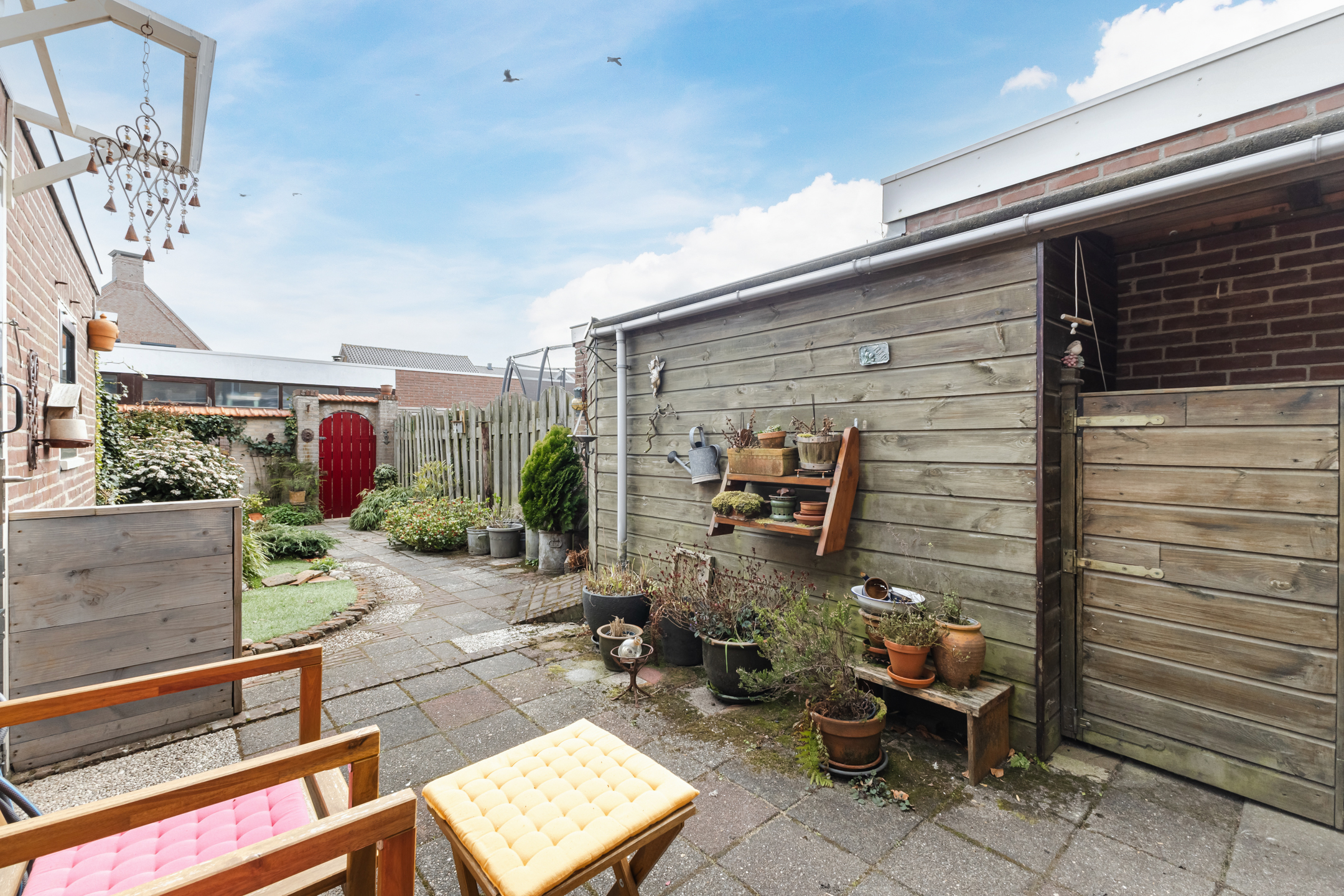 Buiten beschikt de woning over een opvallend diepe achtertuin op het oosten. Dankzij de diepte geniet je hier vrijwel de hele dag van de zon. Achterin de tuin staat een aangebouwde houten berging voor extra opslag. De voorzijde van de woning is gelegen op het westen, waardoor u hier in de middag en avond volop van de zon kunt genieten. Om het binnenklimaat ook op warme dagen aangenaam te houden, is de woning voorzien van een buitenzonwering.