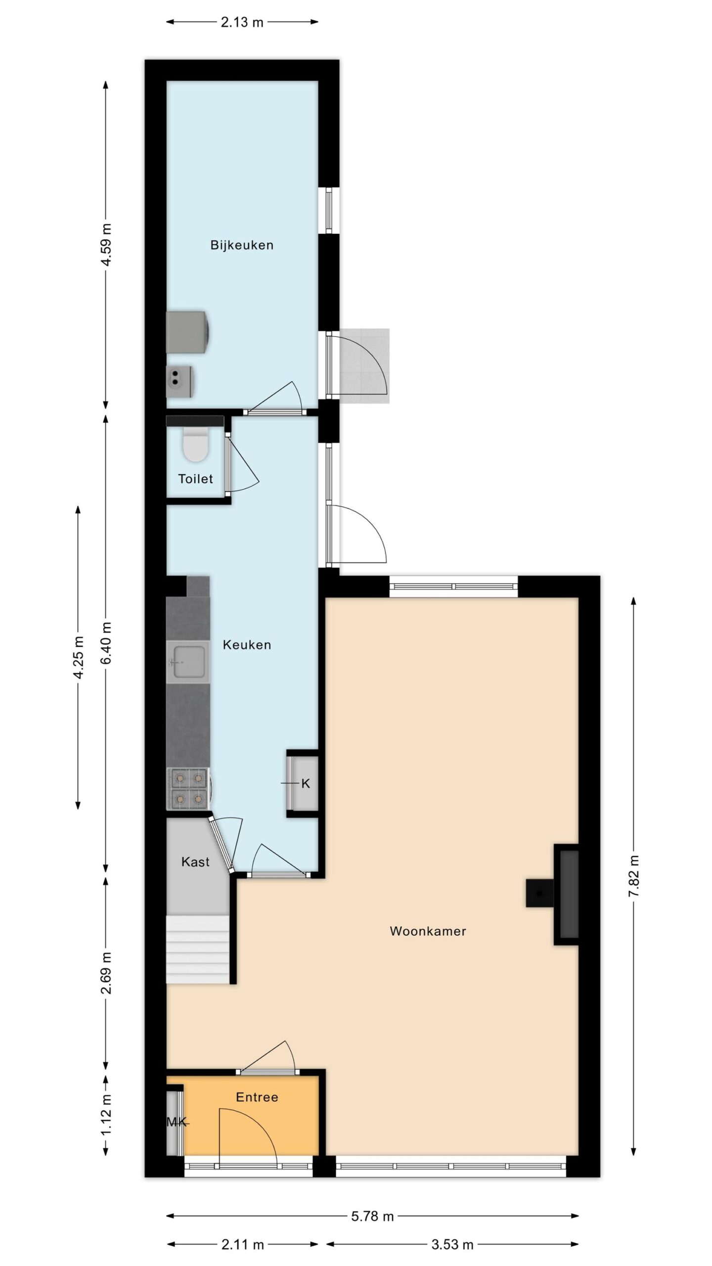 Begane grond: entree, hal, meterkast, woonkamer, trapopgang, keuken, bijkeuken;