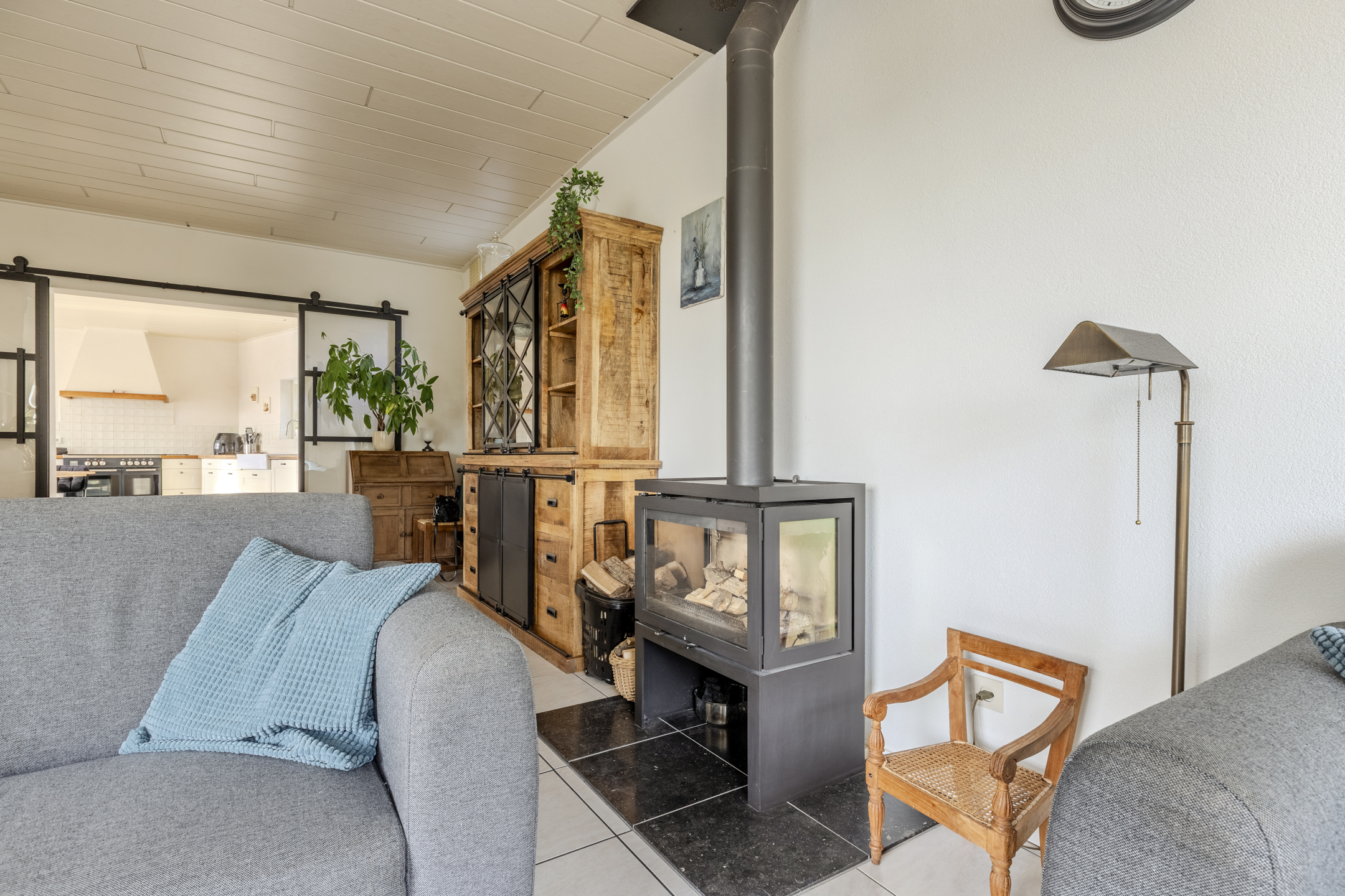 De begane grond begint bij de entree met meterkast, waarna je binnenstapt in de lichte woonkamer met vloerverwarming. Grote ramen laten het landschap bijna het interieur binnenlopen en de houtkachel vormt ’s winters het warme middelpunt van de ruimte. Vanuit de woonkamer bereik je de fraaie woonkeuken in de aanbouw, een heerlijke plek om te koken met zicht op groen.