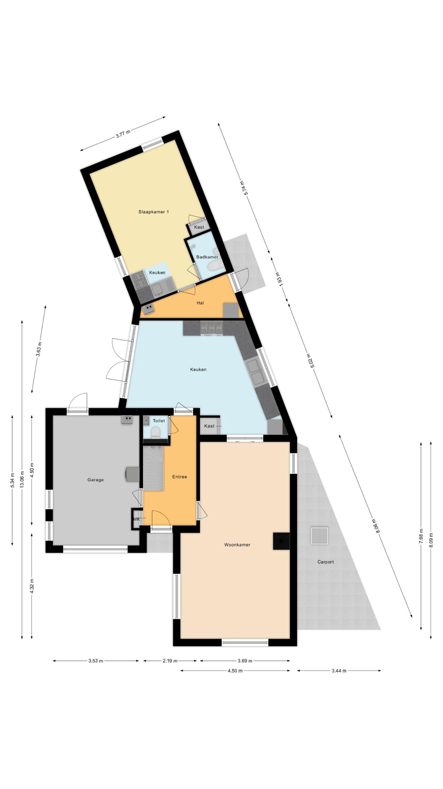 -begane grond: entree met meterkast, woonkamer, keuken, hal, studio en garage.