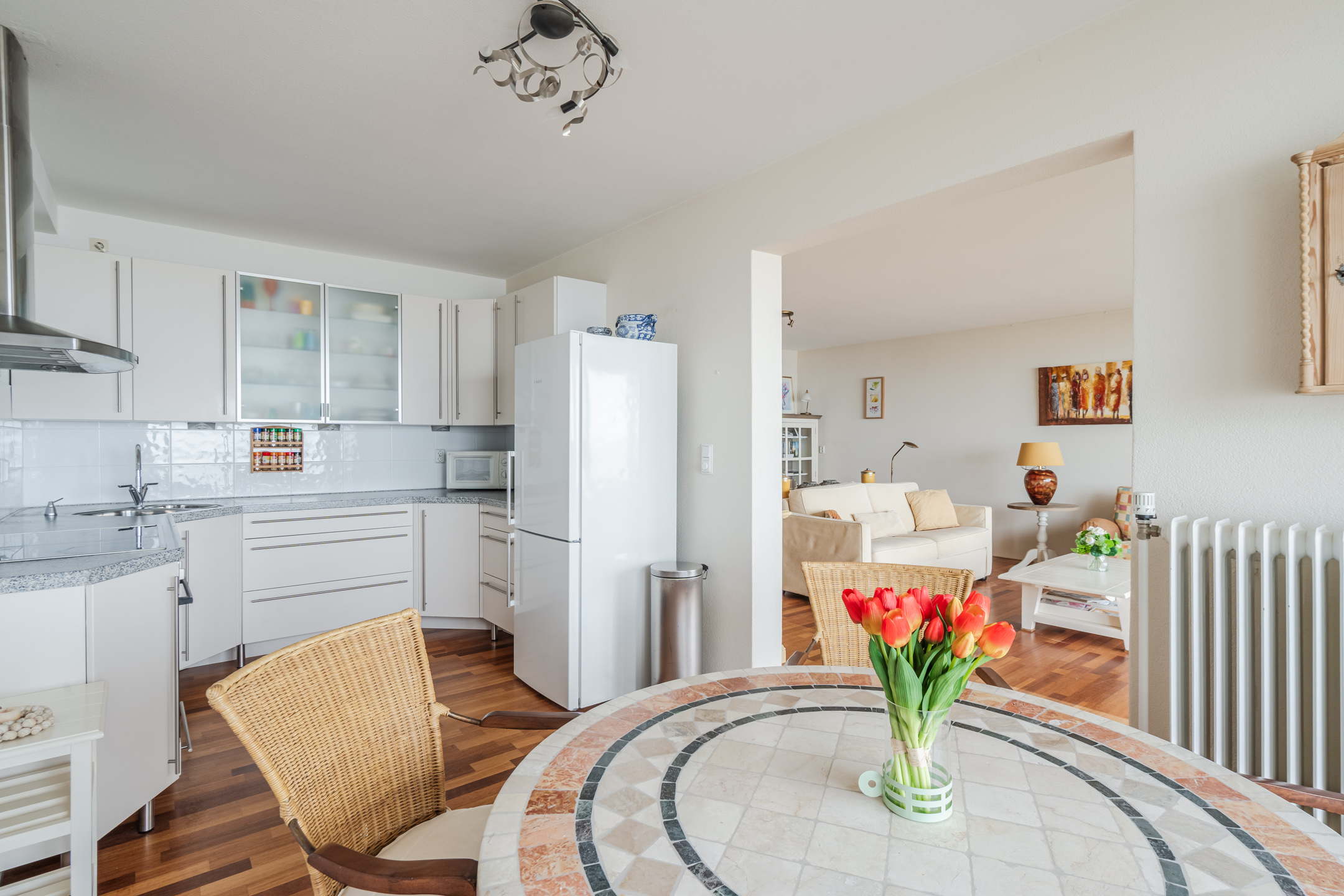 Het appartement bevindt zich op de vierde verdieping en beschikt over 85 m² woonoppervlakte. Er zijn twee slaapkamers en een badkamer. Binnen treft u een lichte, ruime woonkamer met halfopen keuken.