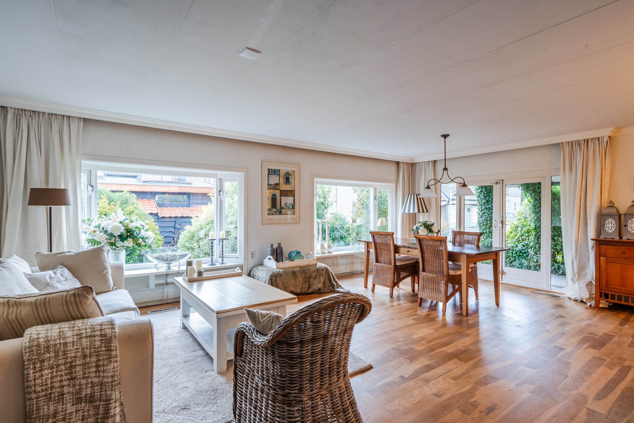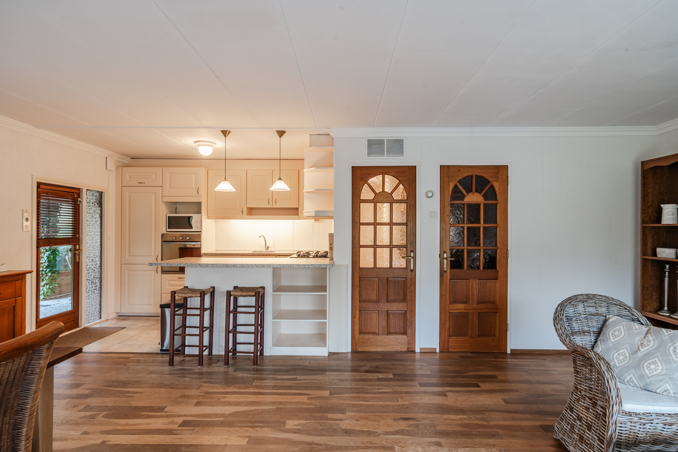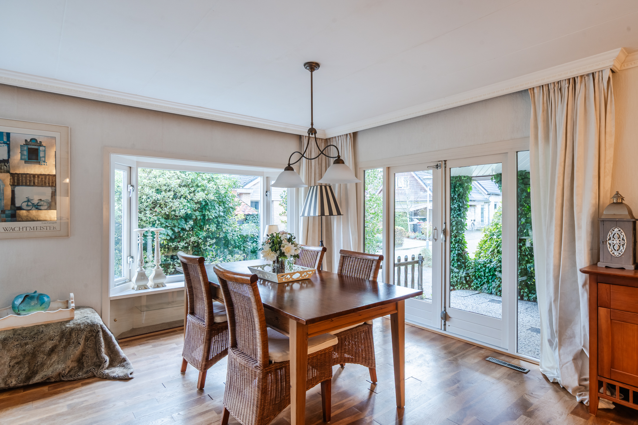 De woonkamer is dankzij de twee erkers heerlijk licht en straalt direct een warme, uitnodigende sfeer uit. Vanuit de grote veranda stap je zo naar binnen: een fijne plek om van vroeg in het voorjaar tot laat in de avond te genieten van buiten. De tuin omsluit de bungalow volledig en biedt altijd een plekje om in de zon of juist in de schaduw te zitten.