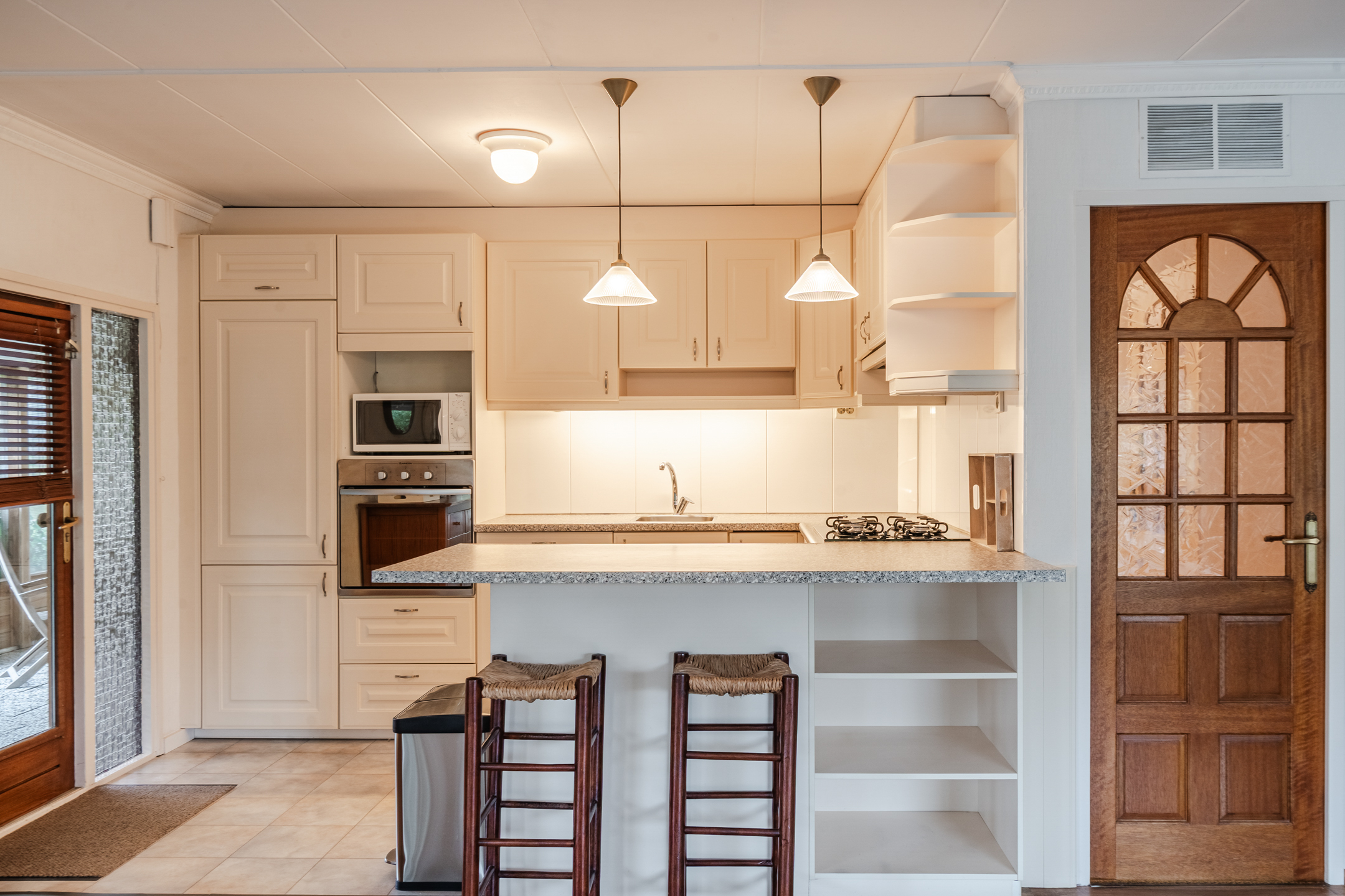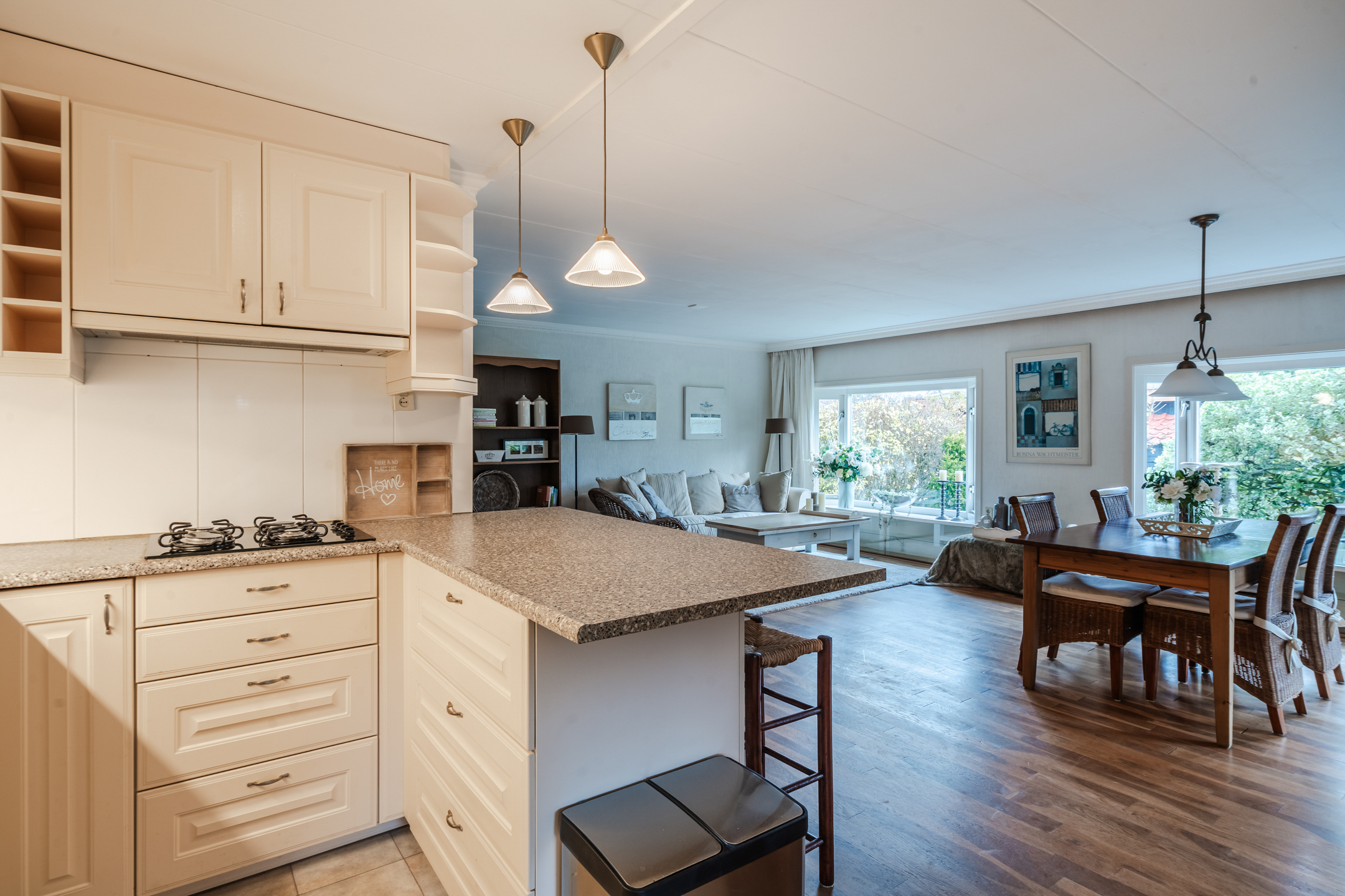 Via de grote, beschutte veranda bereik je de lichte woonkamer met twee erkers en open keuken.