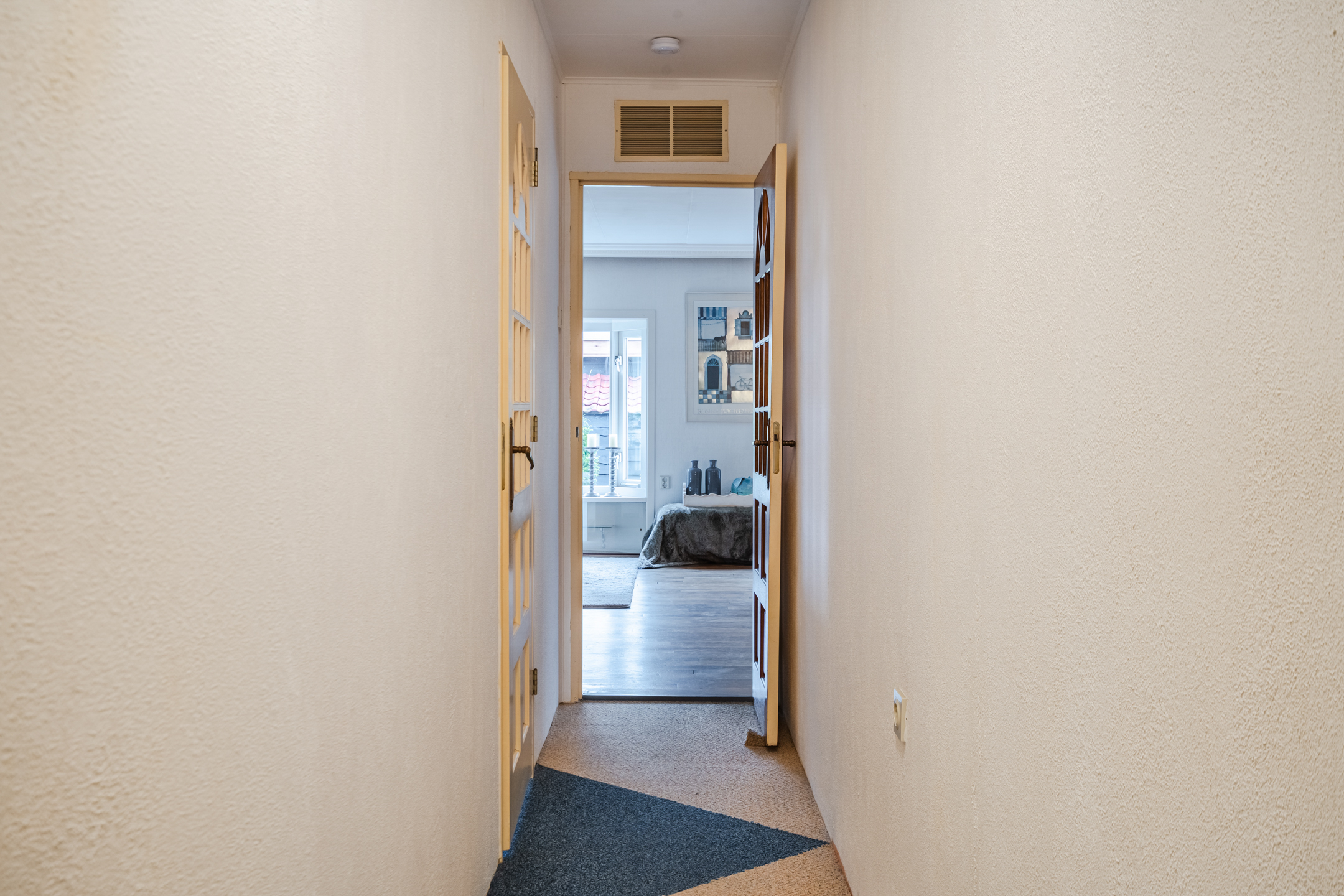 De hal geeft toegang tot twee ruime slaapkamers, de badkamer (voorzien van dubbele wastafel, douche en toilet) en de ruime garage.