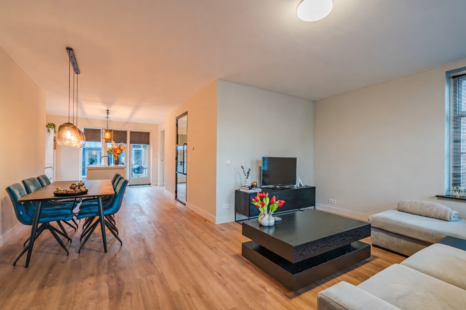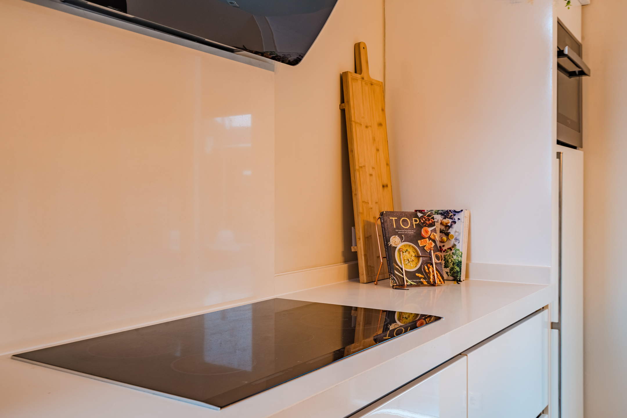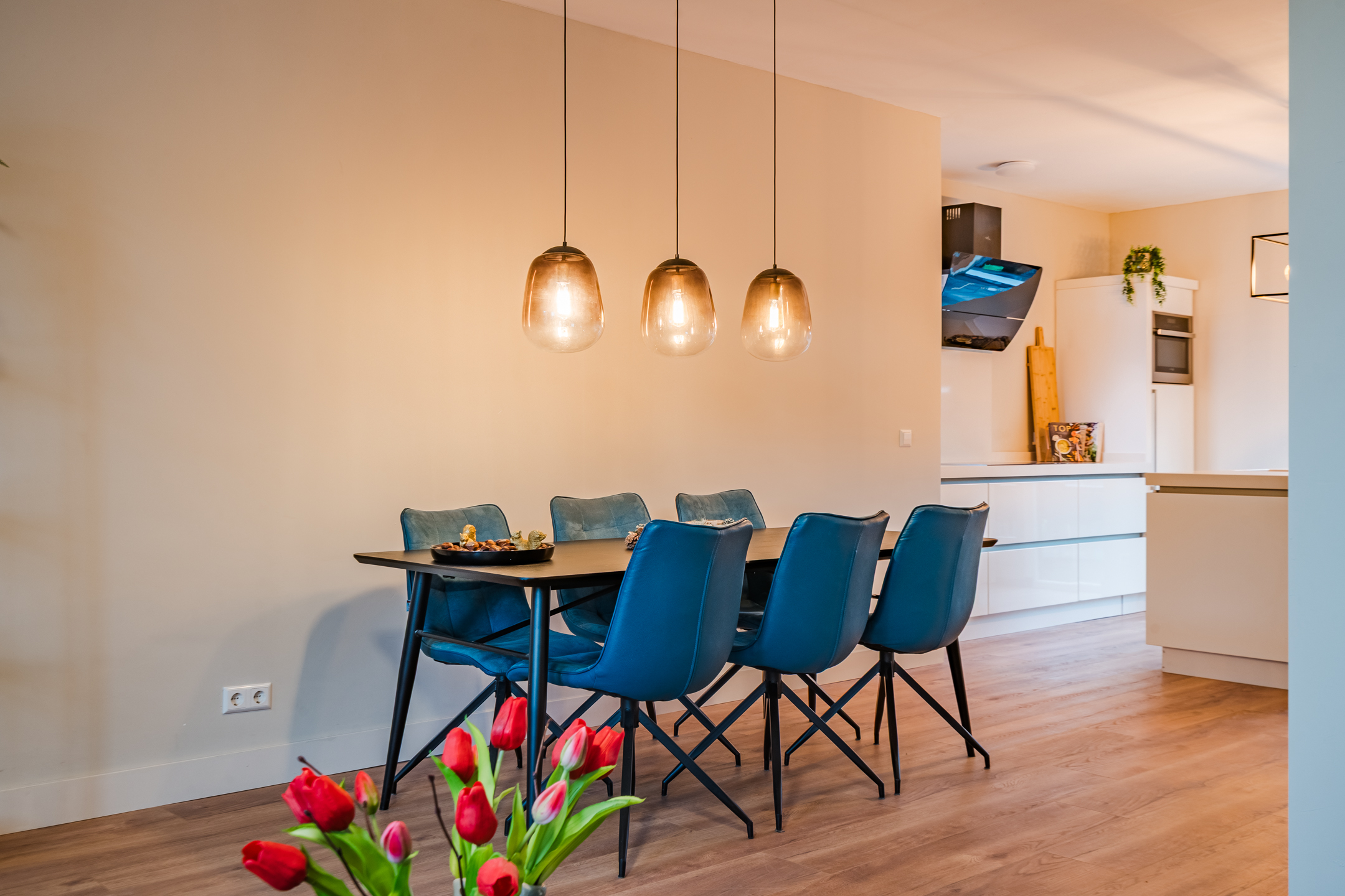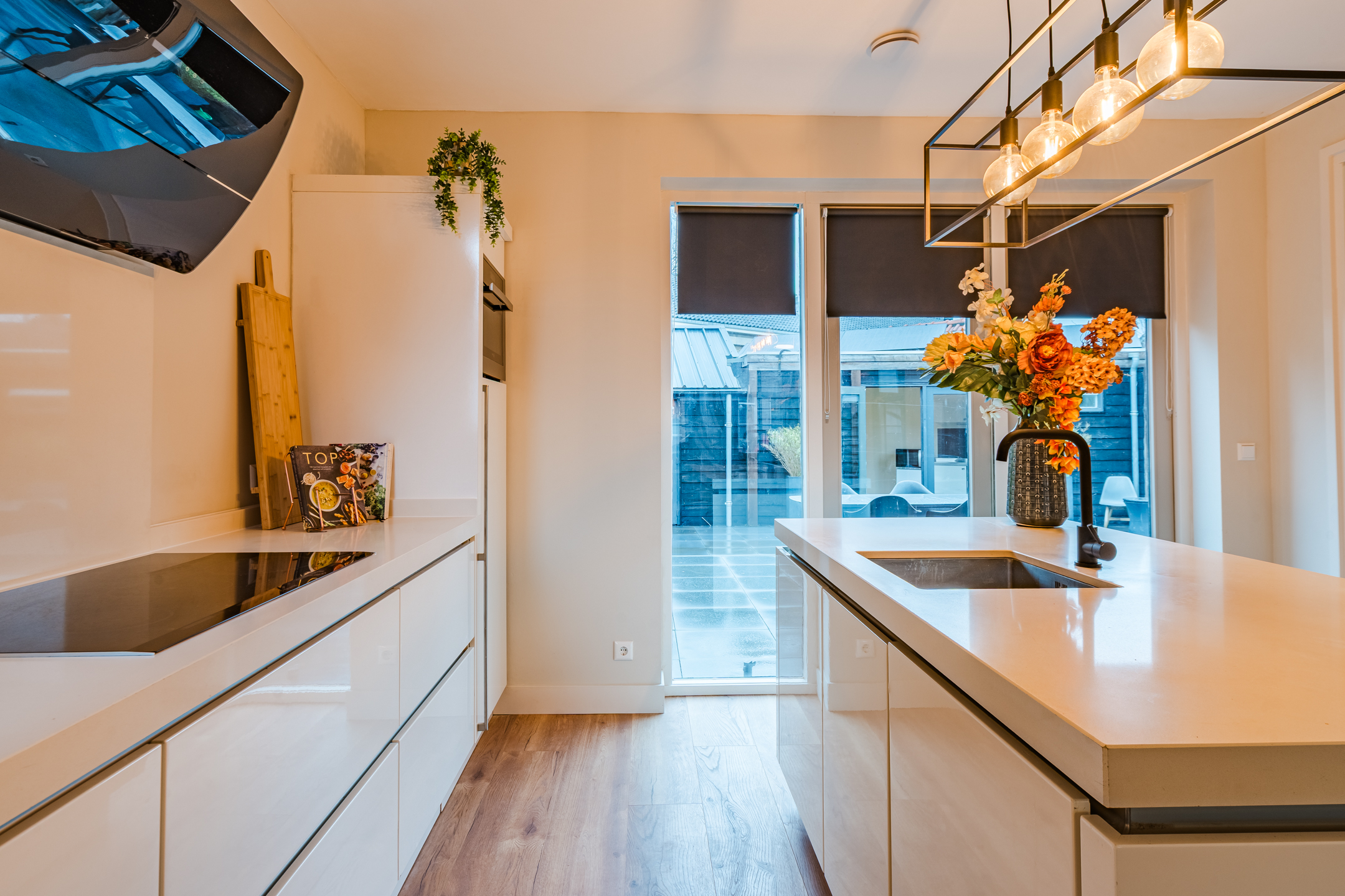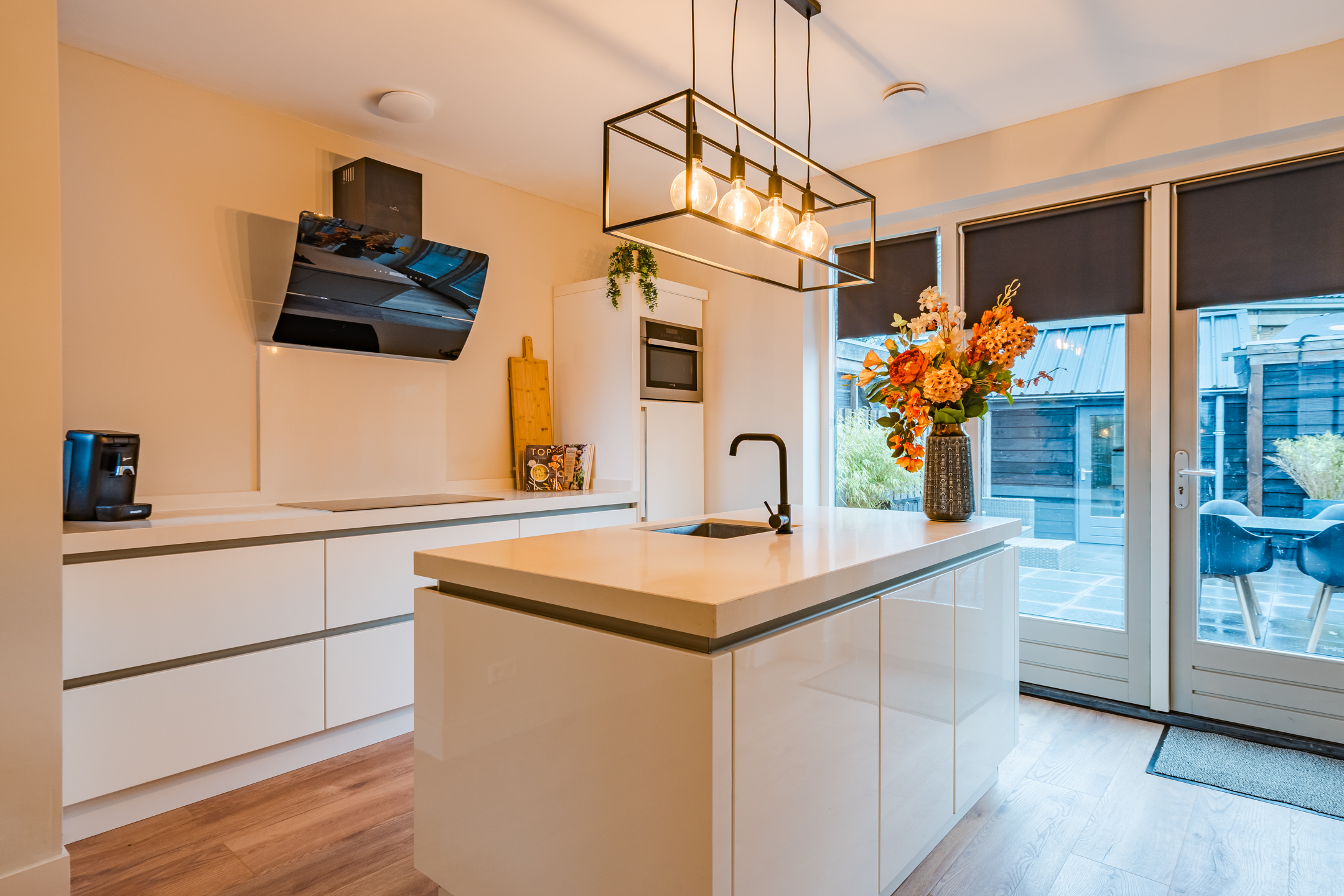 De mooie open keuken met een kookeiland vormt een echte eyecatcher. Voorzien van diverse inbouwapparatuur en openslaande deuren naar de achtertuin is dit een plek waar koken en samenzijn vanzelf samenkomen.