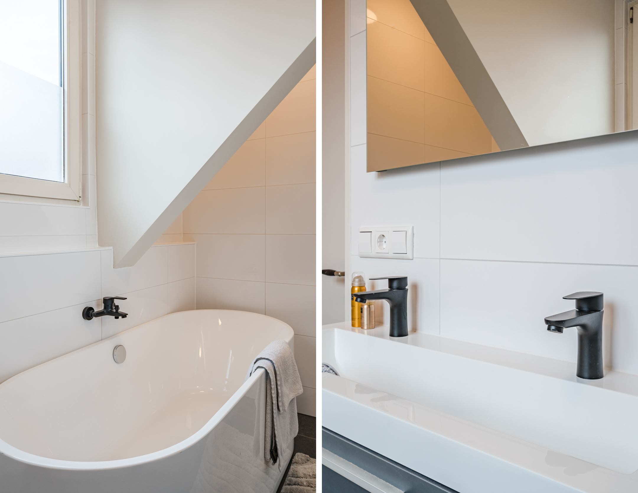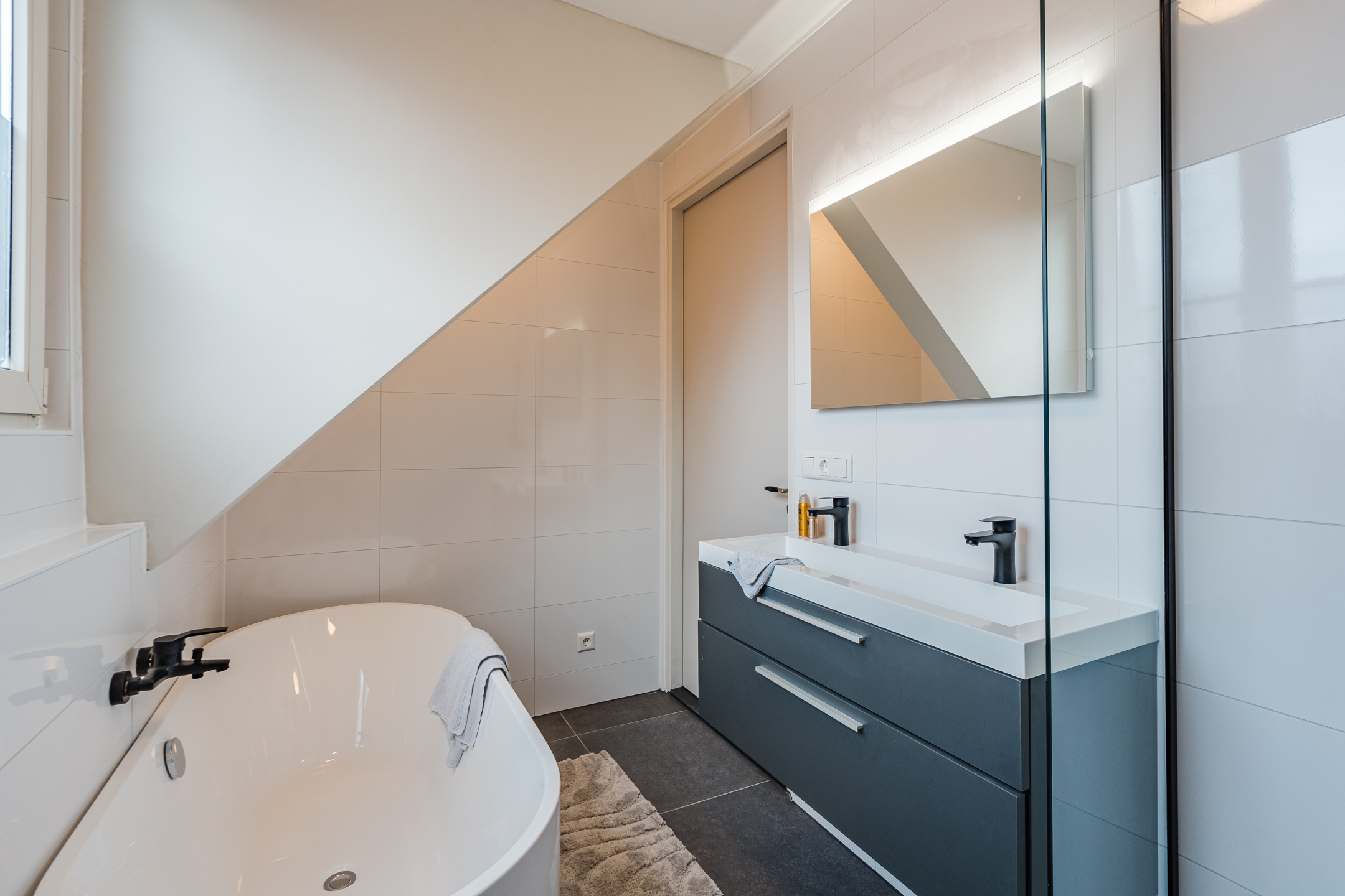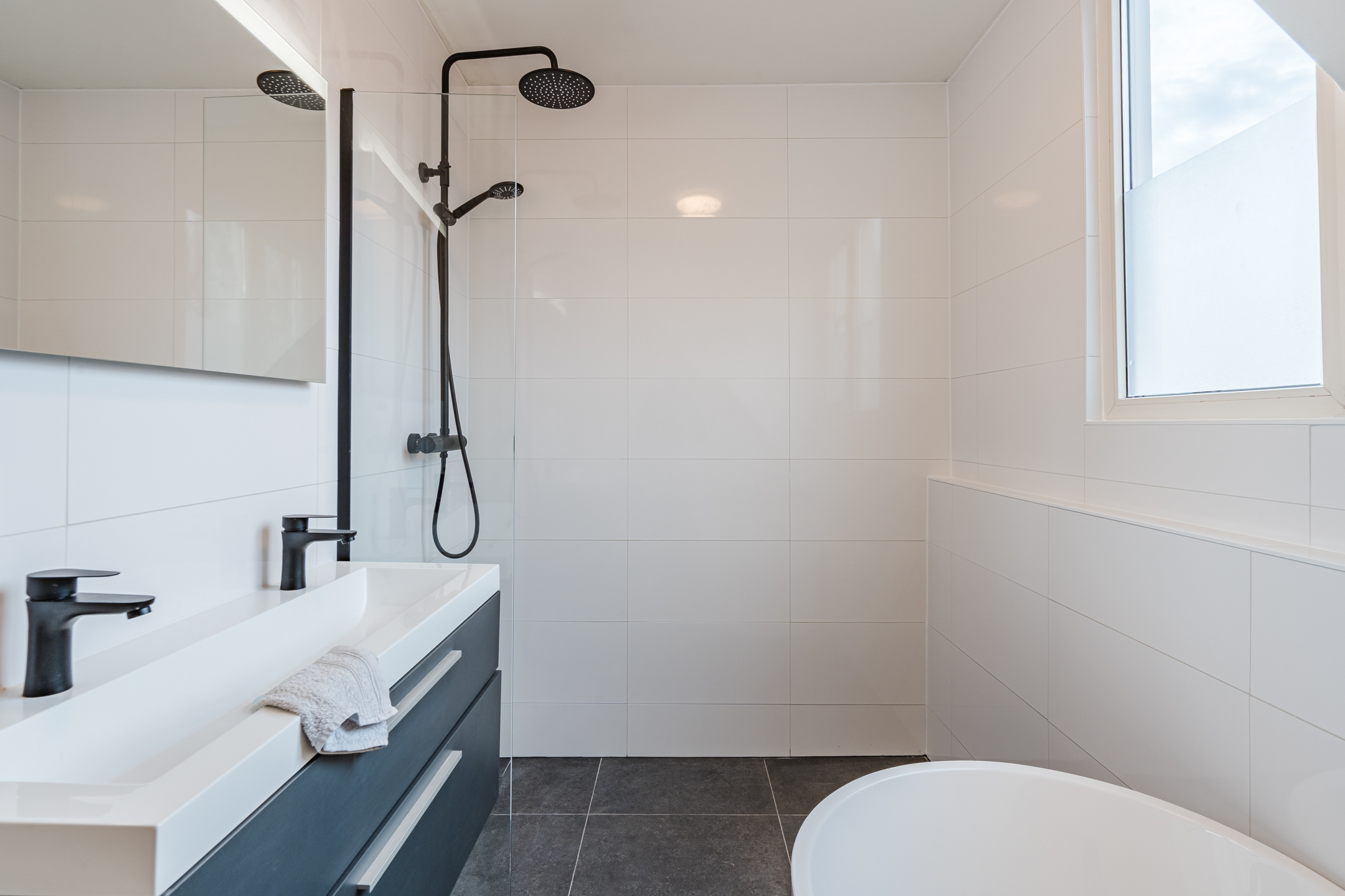 - Badkamervoorzieningen Ligbad, dubbele wastafel, wastafelmeubel, inloopdouche