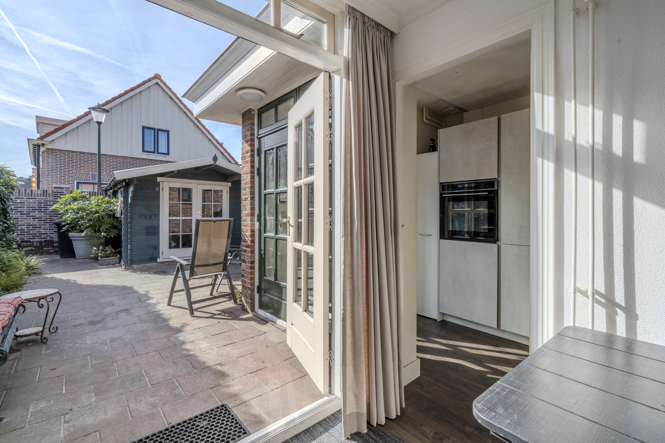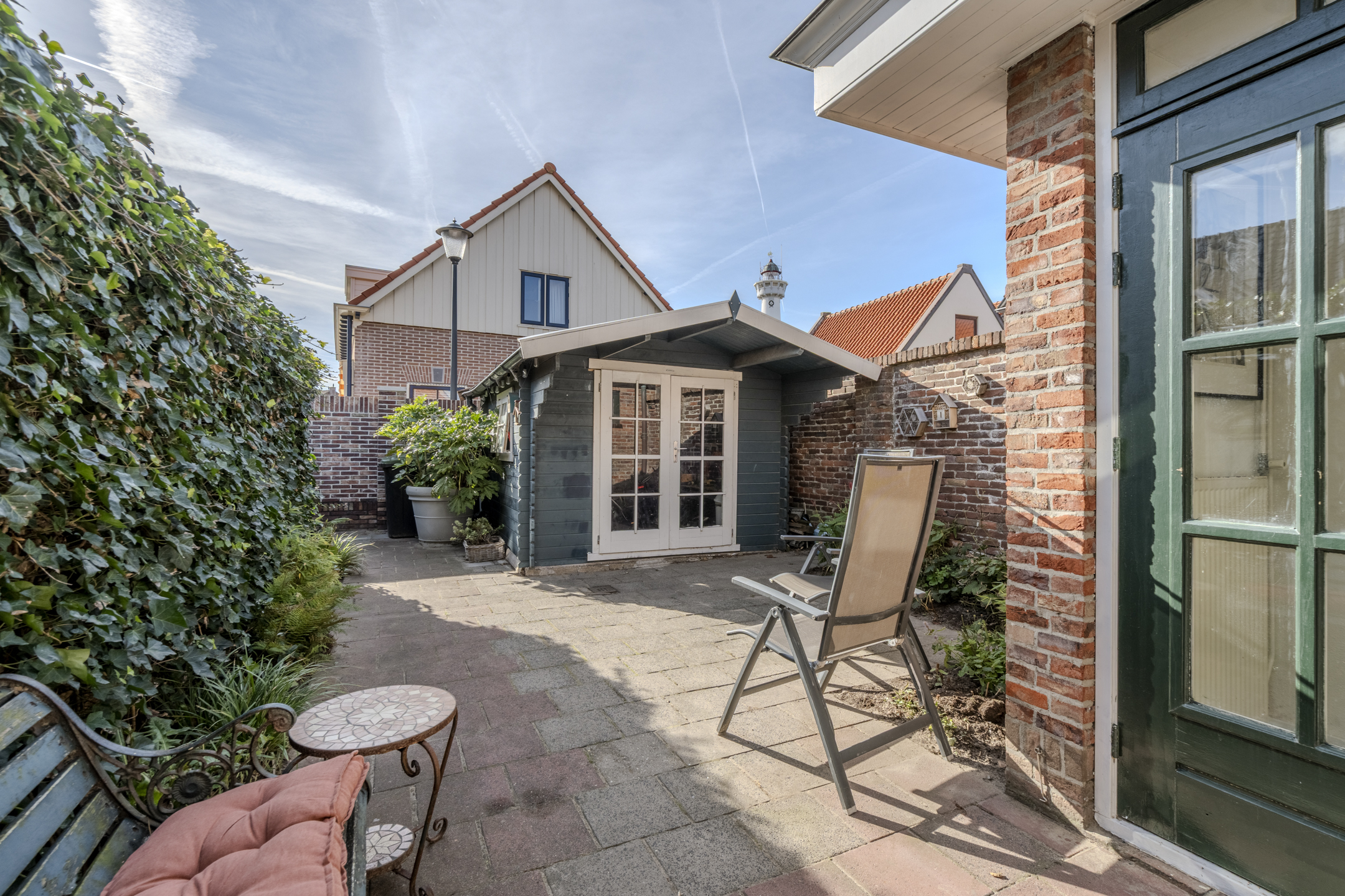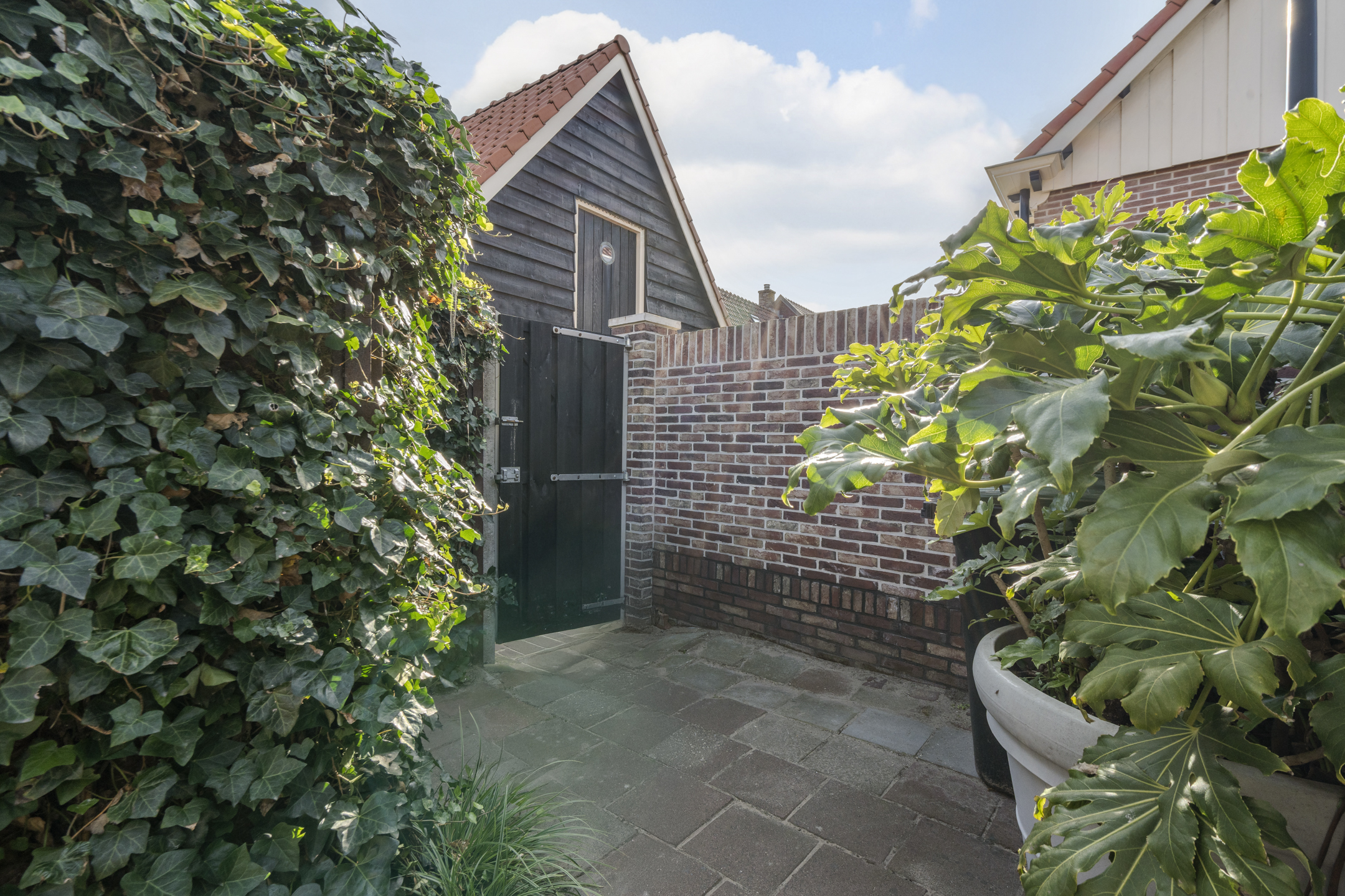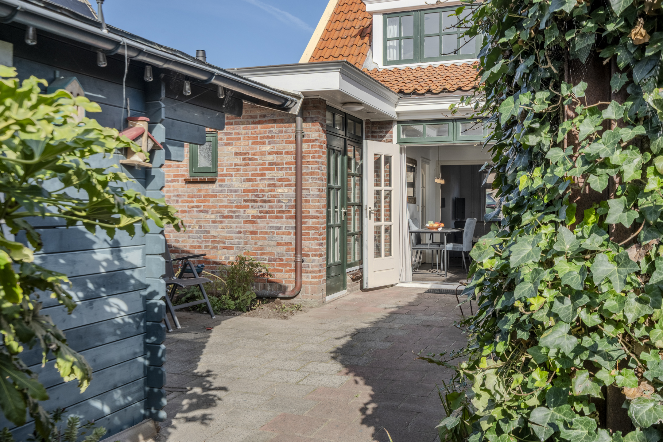 De tuin is heerlijk beschut en biedt vrijwel het hele jaar zon door de ligging op het zuidwesten. Er is verder een ruime houten berging.