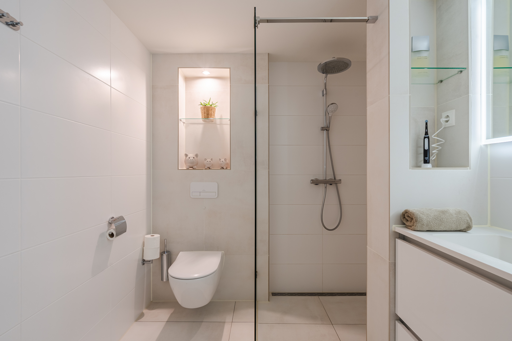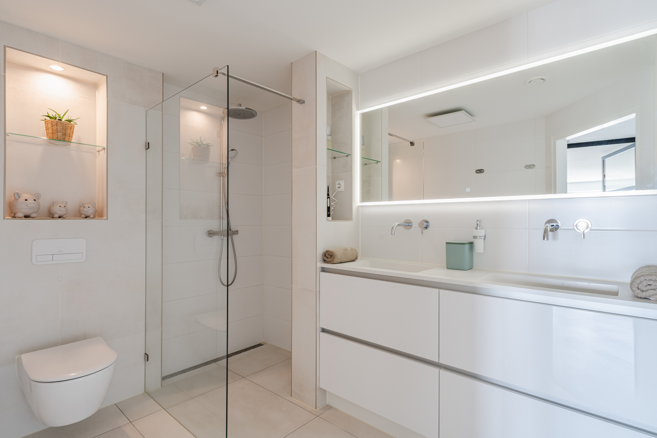 - Badkamervoorzieningen Toilet, douche, dubbele wastafel, wastafelmeubel