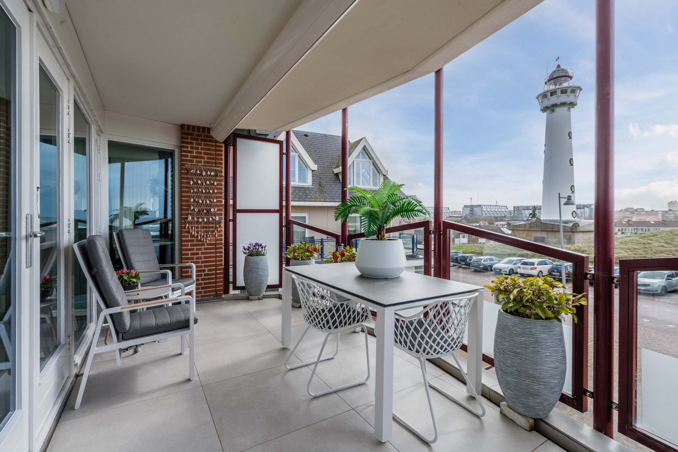 Vanuit de woonkamer en de twee balkons heeft u een panoramisch uitzicht over de Boulevard, de Noordzee, het dorp en de vuurtoren. Beide balkons zijn fraai afgewerkt en voorzien van keramische tegels. De garage in het souterrain biedt voldoende plek voor een grote auto, uw (elektrische) fietsen en/of opslag van andere spullen.