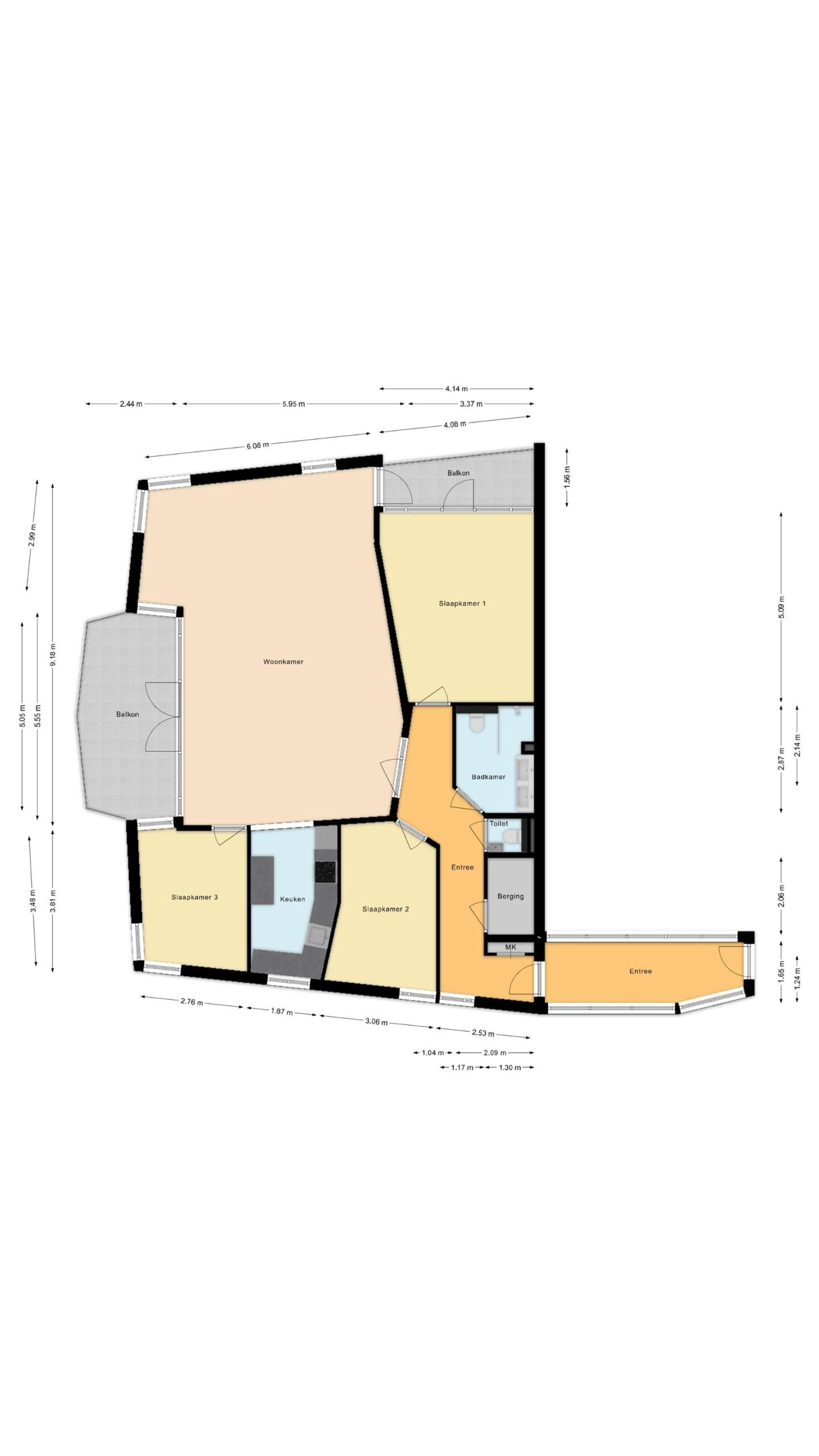Appartement: privé-entree, voordeur, hal, deur naar eerste slaapkamer, berging/bijkeuken met witgoedopstelling, gastentoilet, badkamer voorzien van inloopdouche, meubel met dubbele wasbak en tweede toilet, woonkamer met openslaande deuren naar de twee balkons (zuid en west), tweede slaapkamer met openslaande deur naar het inpandige west-balkon, derde slaapkamer.